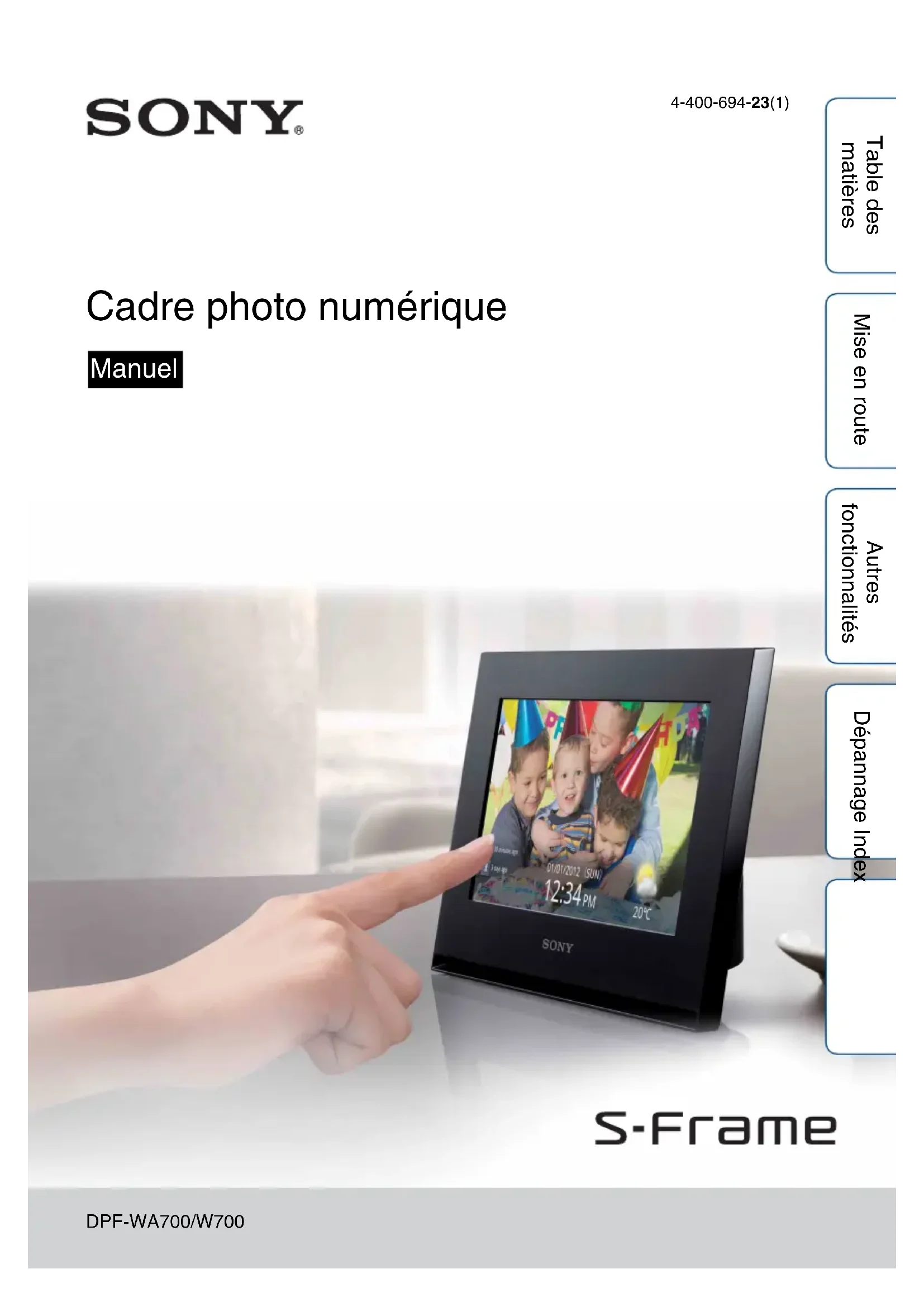 DPF-WA700/W700 4-400-694-23(1) Table des matières Mise en route Autres fonctionnalités Dépannage Index Cadre photo numérique ManuelTable des matières Mise en route Autres fonctionnalités Dépannage Index