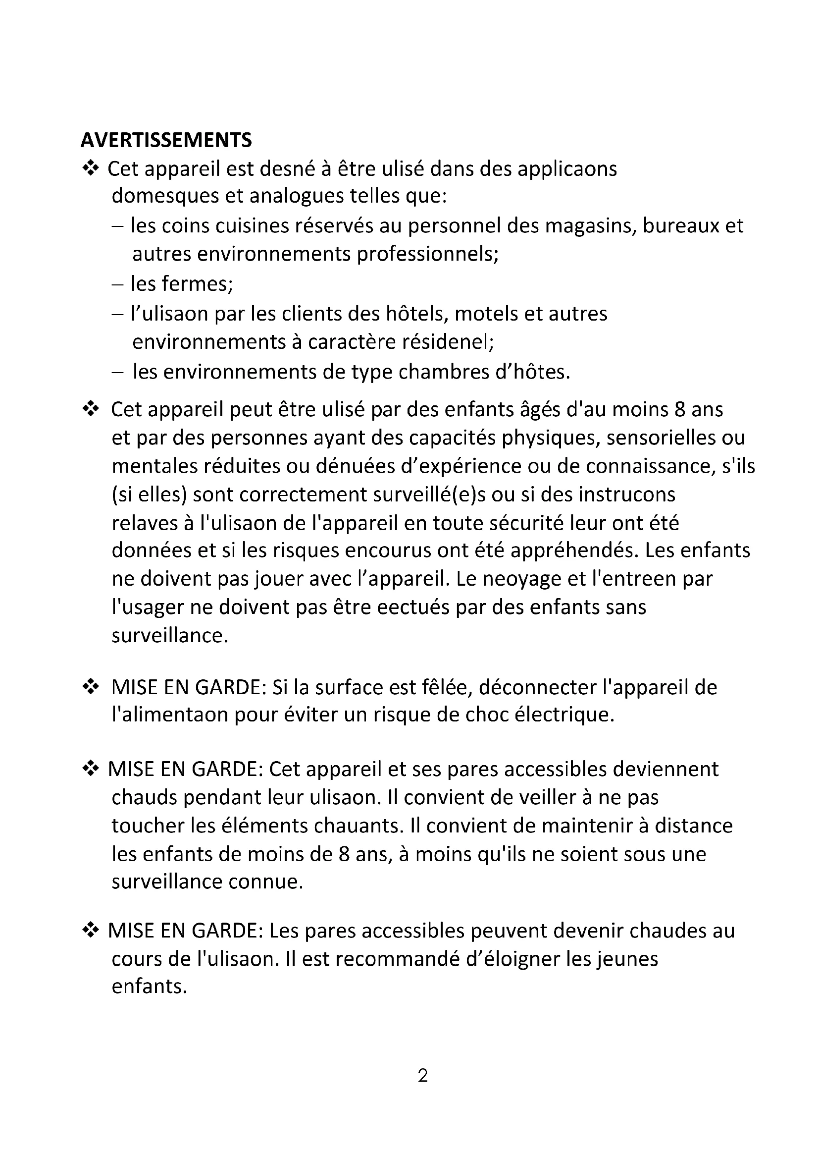 AVERTISSEMENTS2 AVERTISSEMENTS Cet appareil est destiné à être utilisé dans des applications domestiques et analogues telles que: les coins cuisines réservés au personnel des magasins, bureaux et autres environnements professionnels; les fermes; l’utilisation par les clients des hôtels, motels et autres environnements à caractère résidentiel; les environnements de type chambres d’hôtes. Cet appareil peut être utilisé par des enfants âgés d'au moins 8 ans et par des personnes ayant des capacités physiques, sensorielles ou mentales réduites ou dénuées d’expérience ou de connaissance, s'ils (si elles) sont correctement surveillé(e)s ou si des instructions relatives à l'utilisation de l'appareil en toute sécurité leur ont été données et si les risques encourus ont été appréhendés. Les enfants ne doivent pas jouer avec l’appareil. Le nettoyage et l'entretien par l'usager ne doivent pas être effectués par des enfants sans surveillance. MISE EN GARDE: Si la surface est fêlée, déconnecter l'appareil de l'alimentation pour éviter un risque de choc électrique. MISE EN GARDE: Cet appareil et ses parties accessibles deviennent chauds pendant leur utilisation. Il convient de veiller à ne pas toucher les éléments chauffants. Il convient de maintenir à distance les enfants de moins de 8 ans, à moins qu'ils ne soient sous une surveillance continue. MISE EN GARDE: Les parties accessibles peuvent devenir chaudes au cours de l'utilisation. Il est recommandé d’éloigner les jeunes enfants.3 Ces surfaces sont susceptibles de devenir chaudes. Ne pas utiliser d’appareil de nettoyage à la vapeur. Il est recommandé de ne pas déposer d'objets métalliques tels que couteaux, fourchettes, cuillères et couvercles sur le plan de cuisson, car ils peuvent devenir chauds. Après utilisation, arrêter le fonctionnement de la table de cuisson au moyen de son dispositif de commande et ne pas compter sur le détecteur de casseroles. Cet appareil n’est pas destiné à être mis en fonctionnement au moyen d'une minuterie extérieure ou par un système de commande à distance séparé. MISE EN GARDE: Laisser cuire des aliments sans surveillance sur une table de cuisson en utilisant des matières grasses ou de l'huile peut être dangereux et déclencher un incendie. NE JAMAIS essayer d'éteindre un incendie avec de l'eau, mais arrêter l'appareil puis couvrir les flammes par exemple avec un couvercle ou une couverture anti-feu. MISE EN GARDE: Risque d'incendie: ne pas entreposer d'objets sur les surfaces de cuisson. La température des surfaces accessibles peut être élevée lorsque l'appareil est en fonctionnement. Un moyen de déconnexion du réseau d’alimentation ayant une distance d’ouverture des contacts de tous les pôles doit être prévu dans la canalisation fixe conformément aux règles d’installation.4