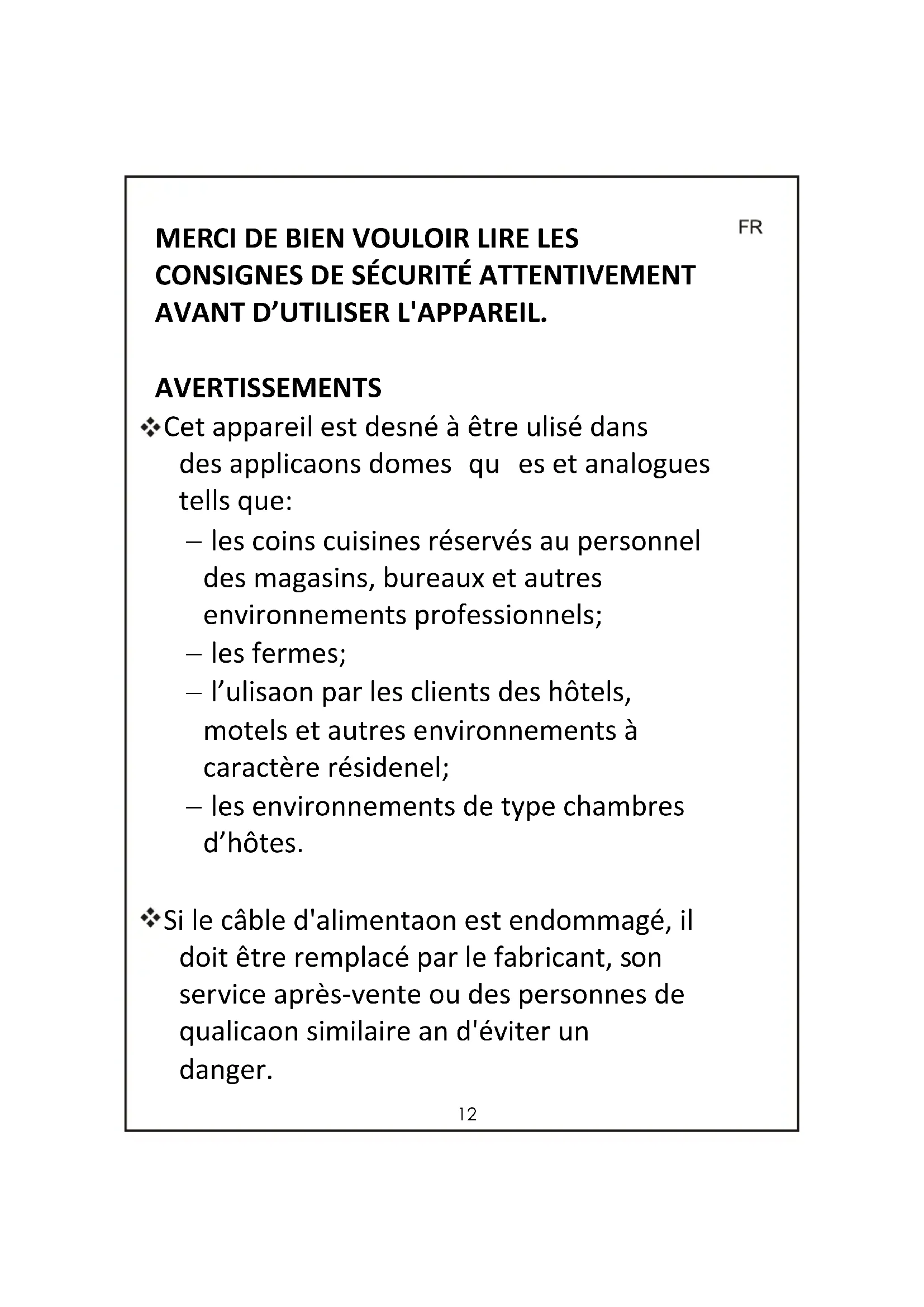 AVANT D’UTILISER L'APPAREIL. AVERTISSEMENTS Cet appareil est destiné à être utilisé dans des applications domes tiqu es et analogues tells que: les coins cuisines réservés au personnel des magasins, bureaux et autres environnements professionnels; les fermes; l’utilisation par les clients des hôtels, motels et autres environnements à caractère résidentiel; les environnements de type chambres d’hôtes. Si le câble d'alimentation est endommagé, il doit être remplacé par le fabricant, s