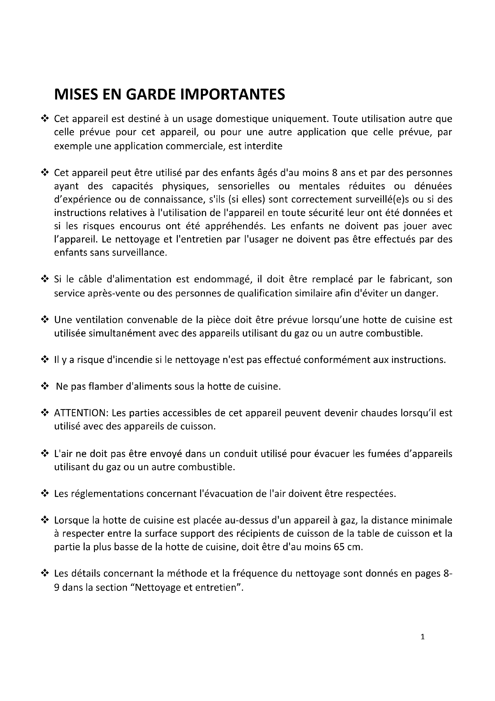 Cet appareil est destiné à un usage domestique uniquement. Toute utilisation autre que celle prévue pour cet appareil, ou pour une autre application que celle prévue, par exemple une application commerciale, est interdite Cet appareil peut être utilisé par des enfants âgés d'au moins 8 ans et par des personnes ayant des capacités physiques, sensorielles ou mentales réduites ou dénuées d’expérience ou de connaissance, s'ils (si elles) sont correctement surveillé(e)s ou si des instructions relatives à l'utilisation de l'appareil en toute sécurité leur ont été données et si les risques encourus ont été appréhendés. Les enfants ne doivent pas jouer avec l’appareil. Le nettoyage et l'entretien par l'usager ne doivent pas être effectués par des enfants sans surveillance. Si le câble d'alimentation est endommagé, il doit être remplacé par le fabricant, son service après-vente ou des personnes de qualification similaire afin d'éviter un danger. Une ventilation convenable de la pièce doit être prévue lorsqu’une hotte de cuisine est utilisée simultanément avec des appareils utilisant du gaz ou un autre combustible. Il y a risque d'incendie si le nettoyage n'est pas effectué conformément aux instructions. Ne pas flamber d'aliments sous la hotte de cuisine. ATTENTION: Les parties accessibles de cet appareil peuvent devenir chaudes lorsqu’il est utilisé avec des appareils de cuisson. L'air ne doit pas être envoyé dans un conduit utilisé pour évacuer les fumées d’appareils utilisant du gaz ou un autre combustible. Les réglementations concernant l'évacuation de l'air doivent être respectées. Lorsque la hotte de cuisine est placée au-dessus d'un appareil à gaz, la distance minimale à respecter entre la surface support des récipients de cuisson de la table de cuisson et la partie la plus basse de la hotte de cuisine, doit être d'au moins 65 cm. Les détails concernant la méthode et la fréquence du nettoyage sont donnés en pages 8- 9 dans la section “Nettoyage et entretien”.2