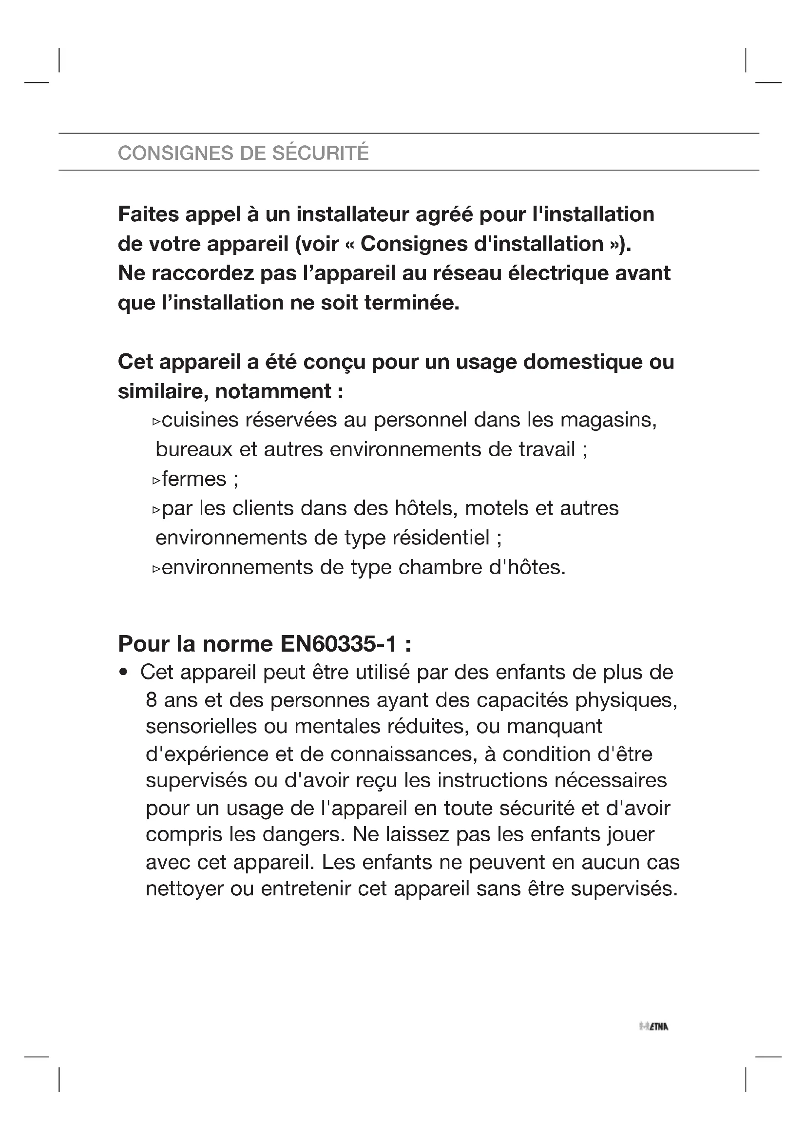 - Cet appareil peut être utilisé par des enfants de plus de 8 ans et des personnes ayant des capacités physiques, sensorielles ou mentales réduites, ou manquant d'expérience et de connaissances, à condition d'être supervisés ou d'avoir reçu les instructions nécessaires pour un usage de l'appareil en toute sécurité et d'avoir compris les dangers. Ne laissez pas les enfants jouer avec cet appareil. Les enfants ne peuvent en aucun cas nettoyer ou entretenir cet appareil sans être supervisés. CONSIGNES DE SÉCURITÉPour la norme IEC60335-1 :