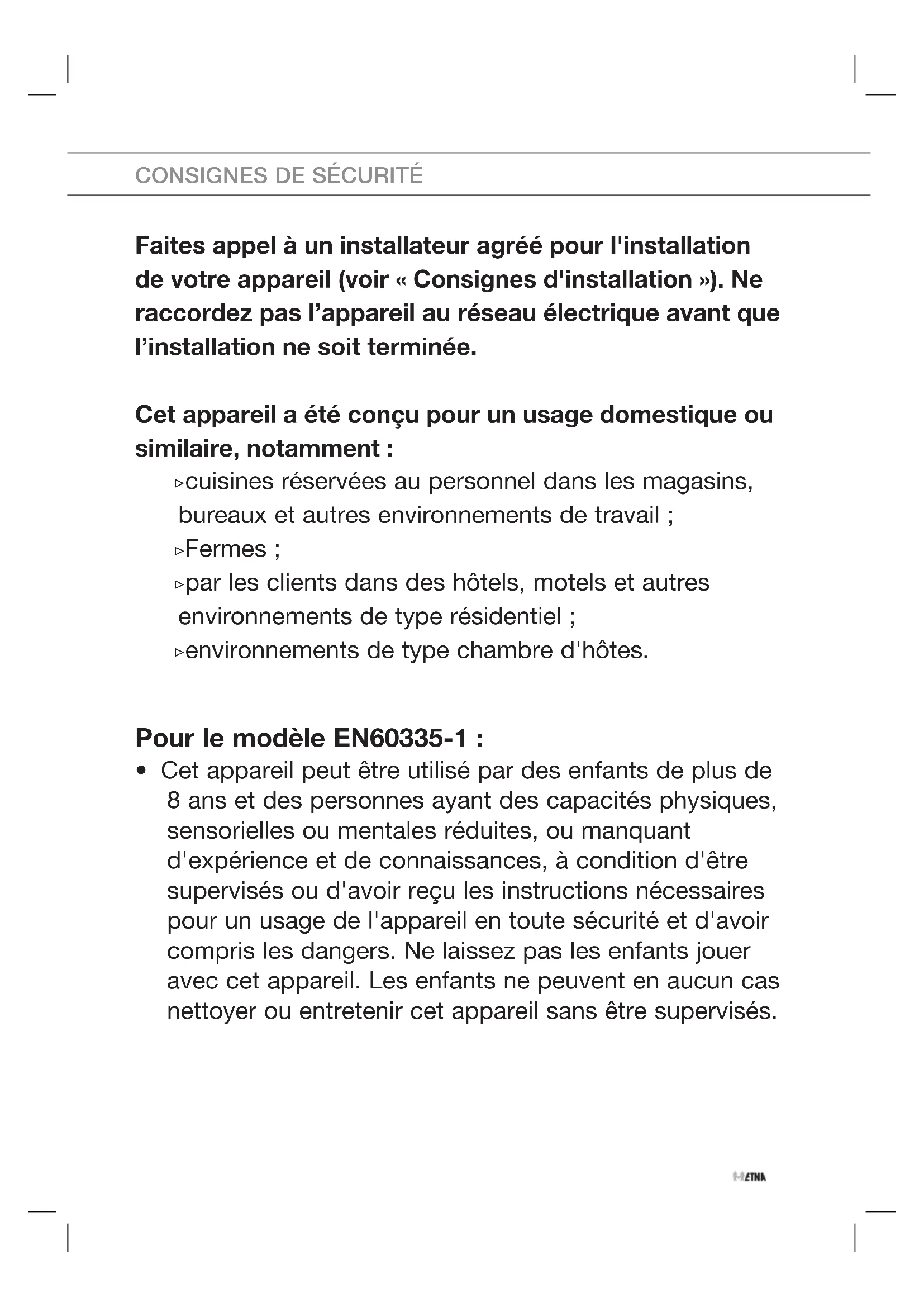 - Cet appareil peut être utilisé par des enfants de plus de 8 ans et des personnes ayant des capacités physiques, sensorielles ou mentales réduites, ou manquant d'expérience et de connaissances, à condition d'être supervisés ou d'avoir reçu les instructions nécessaires pour un usage de l'appareil en toute sécurité et d'avoir compris les dangers. Ne laissez pas les enfants jouer avec cet appareil. Les enfants ne peuvent en aucun cas nettoyer ou entretenir cet appareil sans être supervisés. CONSIGNES DE SÉCURITÉPour le modèle IEC60335-1 :