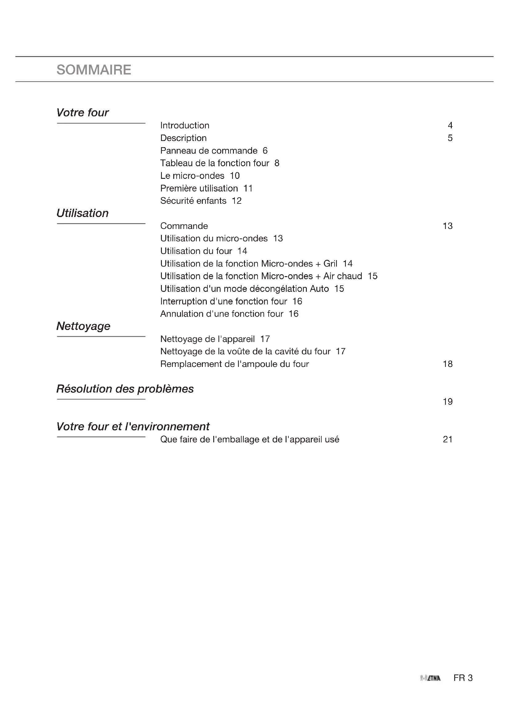 SOMMAIRE Votre four Introduction 4 Description 5 Panneau de commande 6 Tableau de la fonction four 8 Le micro-ondes 10 Première utilisation 11 Sécurité enfants 12 Utilisation Commande 13 Utilisation du micro-ondes 13 Utilisation du four 14 Utilisation de la fonction Micro-ondes + Gril 14 Utilisation de la fonction Micro-ondes + Air chaud 15 Utilisation d'un mode décongélation Auto 15 Interruption d'une fonction four 16 Annulation d'une fonction four 16 Nettoyage Nettoyage de l'appareil 17 Nettoyage de la voûte de la cavité du four 17 Remplacement de l'ampoule du four 18 Résolution des problèmes