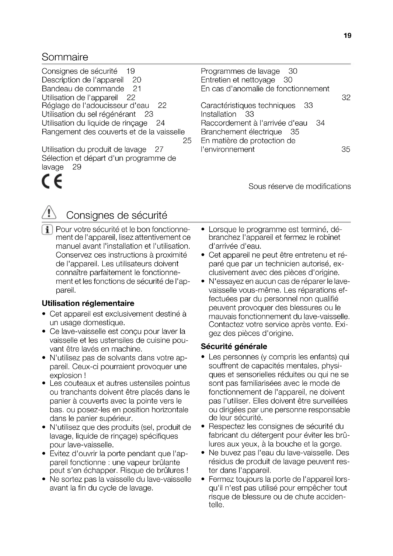 Caractéristiques techniques 33 Installation 33 Raccordement à l'arrivée d'eau 34 Branchement électrique 35 En matière de protection de l'environnement 35 Sous réserve de modifications Consignes de sécurité Pour votre sécurité et le bon fonctionne- ment de l'appareil, lisez attentivement ce manuel avant l'installation et l'utilisation. Conservez ces instructions à proximité de l'appareil. Les utilisateurs doivent connaître parfaitement le fonctionne- ment et les fonctions de sécurité de l'ap- pareil. Utilisation réglementaire