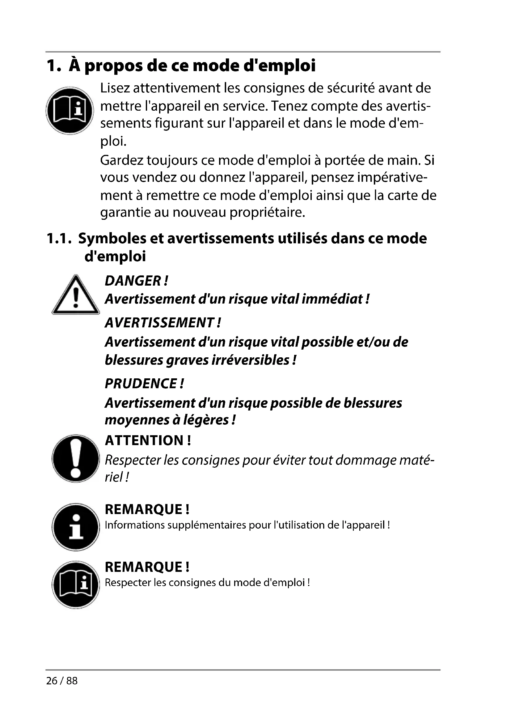 1.1. Symboles et avertissements utilisés dans ce mode d'emploi ..............26
