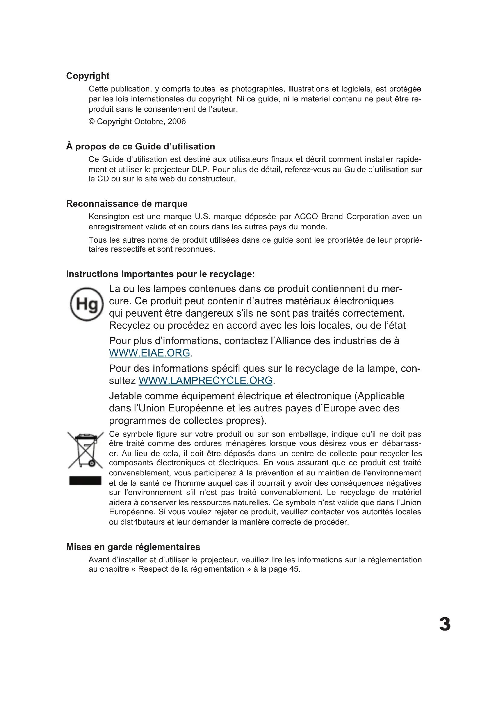 Planar Systems, Inc. Корпоративный Штаб 1195 NW Compton Drive, USA Beaverton, OR 97006-1992 Planar Поддержка Клиента Телефон: США: 1-866-PLANAR1 (866) 752-6271 Внутри США: +1 (503) 748-5799 E-mail: PlanarSupport@planar.com Онлайн Техническая Библиотека: http://www.planar.com/support Часы: M-F, 8am - 8pm ET, 12pm - 12am GMT3 Copyright Cette publication, y compris toutes les photographies, illustrations et logiciels, est protégée par les lois internationales du copyright. Ni ce guide, ni le matériel contenu ne peut être re- produit sans le consentement de l’auteur. © Copyright Octobre, 2006 À propos de ce Guide d’utilisation Ce Guide d’utilisation est destiné aux utilisateurs fi naux et décrit comment installer rapide- ment et utiliser le projecteur DLP. Pour plus de détail, referez-vous au Guide d’utilisation sur le CD ou sur le site web du constructeur. Reconnaissance de marque Kensington est une marque U.S. marque déposée par ACCO Brand Corporation avec un enregistrement valide et en cours dans les autres pays du monde. Tous les autres noms de produit utilisées dans ce guide sont les propriétés de leur proprié- taires respectifs et sont reconnues. Instructions importantes pour le recyclage: La ou les lampes contenues dans ce produit contiennent du mer- cure. Ce produit peut contenir d’autres matériaux électroniques qui peuvent être dangereux s’ils ne sont pas traités correctement. Recyclez ou procédez en accord avec les lois locales, ou de l’état Pour plus d’informations, contactez l’Alliance des industries de à WWW.EIAE.ORG. Pour des informations spécifi ques sur le recyclage de la lampe, con- sultez WWW.LAMPRECYCLE.ORG. Jetable comme équipement électrique et électronique (Applicable dans l’Union Européenne et les autres payes d’Europe avec des programmes de collectes propres). Ce symbole fi gure sur votre produit ou sur son emballage, indique qu’il ne doit pas être traité comme des ordures ménagères lorsque vous désirez vous en débarrass- er. Au lieu de cela, il doit être déposés dans un centre de collecte pour recycler les composants électroniques et électriques. En vous assurant que ce produit est traité convenablement, vous participerez à la prévention et au maintien de l’environnement et de la santé de l’homme auquel cas il pourrait y avoir des conséquences négatives sur l’environnement s’il n’est pas traité convenablement. Le recyclage de matériel aidera à conserver les ressources naturelles. Ce symbole n’est valide que dans l’Union Européenne. Si vous voulez rejeter ce produit, veuillez contacter vos autorités locales ou distributeurs et leur demander la manière correcte de procéder. Mises en garde réglementaires Avant d’installer et d’utiliser le projecteur, veuillez lire les informations sur la réglementation au chapitre « Respect de la réglementation » à la page 45.4 Enregistrez votre produit planar aujourd’hui Merci d’avoir choisi Planar. Pour être sûr de recevoir tous les services et bénéfi ces et de votre produit Planar enregistrez votre produit Planar aujourd’hui. Visitez notre site web: http://www.planar.com/support/product_registation.html Cables, lampes de remplacement et accessoires Pour trouver des câbles, lampes de remplacement et des accessoires pour votre projecteur Planar, moniteur LCD, ou tout autre produit Planar, visitez notre boutique en ligne: http://www.PlanarOnlone.com ou trouvez d’autres points de vente de produits Planar http://www.planar.com/howtobuy.5