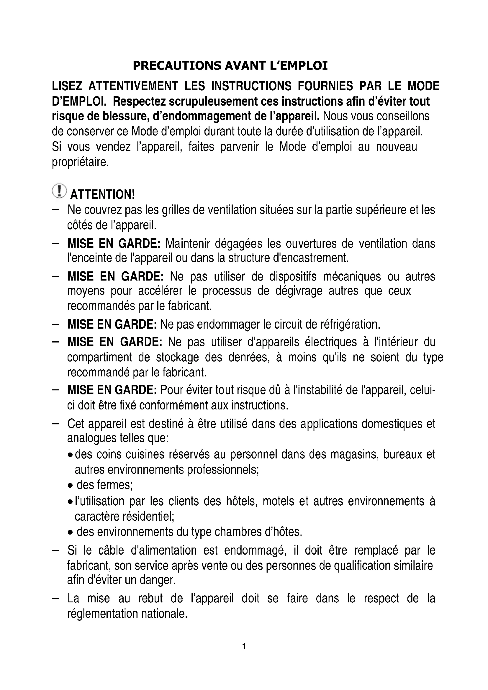 LISEZ ATTENTIVEMENT LES INSTRUCTIONS FOURNIES PAR LE MODE D’EMPLOI. Respectez scrupuleusement ces instructions afin d’éviter tout risque de blessure, d’endommagement de l’appareil. Nous vous conseillons de conserver ce Mode d’emploi durant toute la durée d’utilisation de l’appareil. Si vous vendez l’appareil, faites parvenir le Mode d’emploi au nouveau propriétaire. ATTENTION! – Ne couvrez pas les grilles de ventilation situées sur la partie supérieure et les côtés de l’appareil. – MISE EN GARDE: Maintenir dégagées les ouvertures de ventilation dans l'enceinte de l'appareil ou dans la structure d'encastrement. – MISE EN GARDE: Ne pas utiliser de dispositifs mécaniques ou autres moyens pour accélérer le processus de dégivrage autres que ceux recommandés par le fabricant. – MISE EN GARDE: Ne pas endommager le circuit de réfrigération. – MISE EN GARDE: Ne pas utiliser d'appareils électriques à l'intérieur du compartiment de stockage des denrées, à moins qu'ils ne soient du type recommandé par le fabricant. – MISE EN GARDE: Pour éviter tout risque dû à l'instabilité de l'appareil, celui- ci doit être fixé conformément aux instructions. – Cet appareil est destiné à être utilisé dans des applications domestiques et analogues telles que: