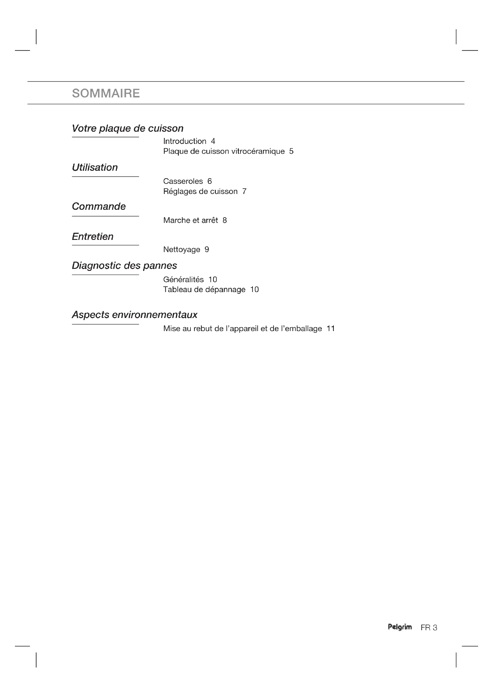 - N’utilisez jamais d’objets pointus, comme de la paille de fer ou des éponges métalliques. ENTRETIENFR 10 Généralités Si vous remarquez une fissure dans la surface en verre (aussi petite soit-elle), arrêtez immédiatement la plaque de cuisson, débranchez la plaque, désactivez le(s) fusible(s) automatique(s) au niveau du compteur électrique ou, si l'appareil est raccordé de façon permanente, réglez le commutateur du câble d'alimentation électrique sur zéro. Prenez contact avec le service après-vente. Tableau de dépannage Si l’appareil ne fonctionne pas correctement, cela ne veut pas nécessairement dire qu’il est défectueux. Essayez tout d'abord de résoudre le problème vous-même. Pour ce faire, vérifiez les points suivants ou consultez pour plus d’informations le site « www.pelgrim.nl ». Symptôme Cause possible Solution Une légère odeur est perceptible lors des premières utilisations de la plaque de cuisson. L'appareil neuf chauffe. Cela est normal et disparaîtra après quelques utilisations. Aérez la cuisine. Les casseroles font beaucoup de bruit pendant la cuisson. Cela est dû à la transmission d'énergie de la plaque de cuisson à la casserole. En puissance de chauffe élevée, ceci est normal pour certaines casseroles. La casserole ou la plaque de cuisson ne risque pas d'être endommagée. La plaque de cuisson ne fonctionne pas et le voyant de contrôle ne s’allume pas. Il n'y a pas d'alimentation électrique, en raison d'un câble défectueux ou d'un branchement erroné. Vérifiez les fusibles ou le commutateur électrique (s'il n'y a pas de prise). Un fusible fond dès la mise en marche de la plaque de cuisson. La plaque de cuisson est mal raccordée. Vérifiez les raccordements électriques.
