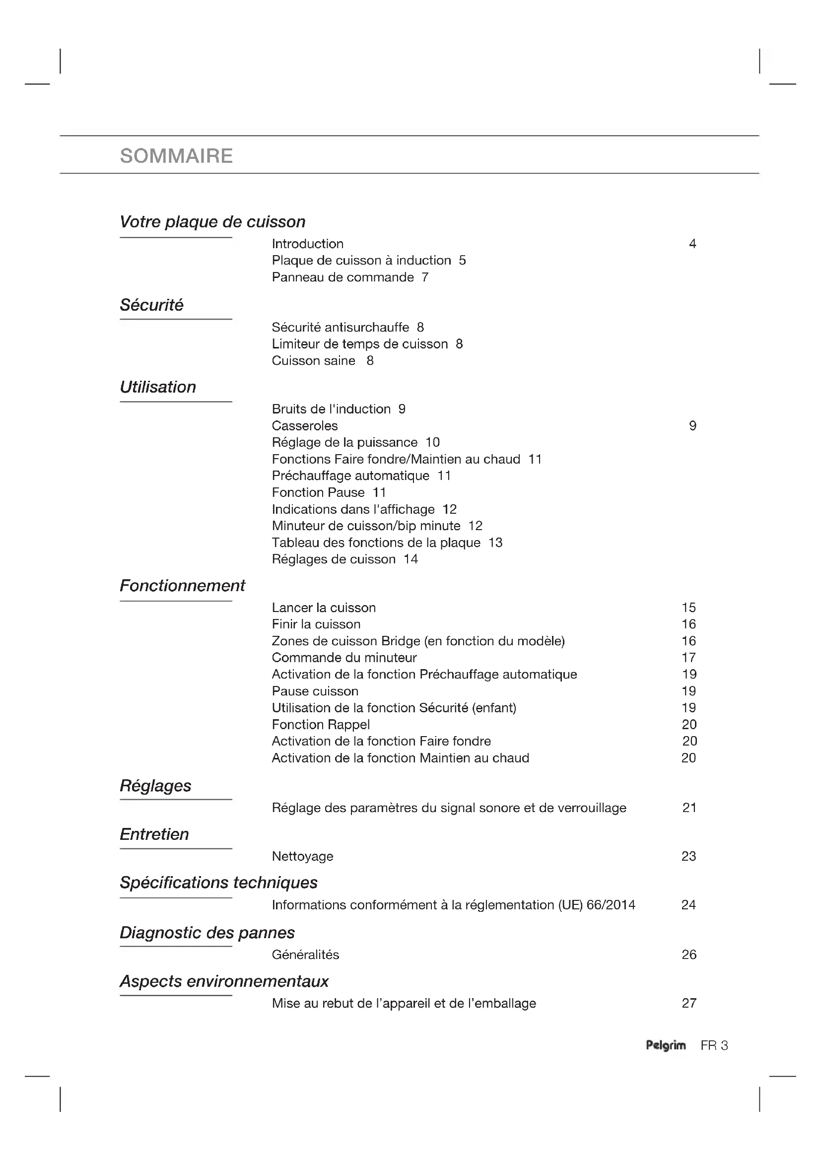 - CFC-free polystyrene (PS hard foam). Dispose of these materials in a responsible manner and in accordance with government regulations. As a reminder of the need to dispose of household appliances separately, the product is marked with the symbol of a crossed-out wheeled dustbin. This means that at the end of its working life, the product must not be disposed of as urban waste. It must be taken to a special local authority differentiated waste collection centre or to a dealer providing this service. Disposing of a household appliance separately avoids possible negative consequences for the environment and health deriving from inappropriate disposal and enables the constituent materials to be recovered to obtain significant savings in energy and resources. Declaration of conformity We declare that our products meet the applicable European Directives, Decisions and Regulations and the requirements listed in the standards referenced.EN 28FR 3 SOMMAIRE Votre plaque de cuisson Introduction 4 Plaque de cuisson à induction 5 Panneau de commande 7 Sécurité Sécurité antisurchauffe 8 Limiteur de temps de cuisson 8 Cuisson saine 8 Utilisation Bruits de l'induction 9 Casseroles 9 Réglage de la puissance 10 Fonctions Faire fondre/Maintien au chaud 11 Préchauffage automatique 11 Fonction Pause 11 Indications dans l'affichage 12 Minuteur de cuisson/bip minute 12 Tableau des fonctions de la plaque 13 Réglages de cuisson 14 Fonctionnement Lancer la cuisson 15 Finir la cuisson 16 Zones de cuisson Bridge (en fonction du modèle) 16 Commande du minuteur 17 Activation de la fonction Préchauffage automatique 19 Pause cuisson 19 Utilisation de la fonction Sécurité (enfant) 19 Fonction Rappel 20 Activation de la fonction Faire fondre 20 Activation de la fonction Maintien au chaud 20 Réglages Réglage des paramètres du signal sonore et de verrouillage 21 Entretien Nettoyage 23 Spécifications techniques Informations conformément à la réglementation (UE) 66/2014 24 Diagnostic des pannes Généralités 26 Aspects environnementaux Mise au rebut de l’appareil et de l’emballage 27FR 4 Introduction Cette plaque de cuisson est destinée aux véritables amateurs de cuisine. Cuire sur une plaque de cuisson à induction présente un certain nombre d’avantages. C’est facile parce que la plaque de cuisson réagit rapidement et aussi parce qu’il est possible de sélectionner des réglages de très faible puissance. Et comme il est de même possible de sélectionner des réglages très puissants, le point d’ébullition des plats est très vite atteint. L’espace généreux entre les zones de cuisson assure un grand confort d’utilisation. La cuisson sur une plaque à induction est différente de celle sur un appareil conventionnel. La cuisson par induction utilise un champ magnétique pour générer de la chaleur. Vous ne pouvez donc pas utiliser n’importe quelle casserole. Le chapitre Casseroles fournit de plus amples informations à ce sujet. Afin d’assurer une sécurité optimale, la plaque de cuisson à induction est équipée de plusieurs dispositifs de sécurité thermique et d'un indicateur de chaleur résiduelle. Ce dernier signale les zones de cuisson qui sont encore chaudes. Ce manuel indique comment utiliser la plaque à induction de façon optimale. En plus des informations relatives au fonctionnement du produit, vous y trouverez des renseignements de base susceptibles d'en faciliter l'utilisation. Il contient également des tableaux de cuisson et des conseils d'entretien. Avant d'utiliser l'appareil, lisez attentivement le manuel et rangez-le en lieu sûr afin de pouvoir le consulter ultérieurement. Le manuel sert également de document de référence pour le service après-vente. Par conséquent, veuillez coller la fiche signalétique de l'appareil dans l'espace prévu à cet effet au verso du manuel. La fiche signalétique de l'appareil contient toutes les informations nécessaires au technicien du service après-vente pour répondre à vos besoins et à vos questions de façon satisfaisante. Les instructions d’installation sont fournies séparément. Nous vous souhaitons bien du plaisir culinaire !