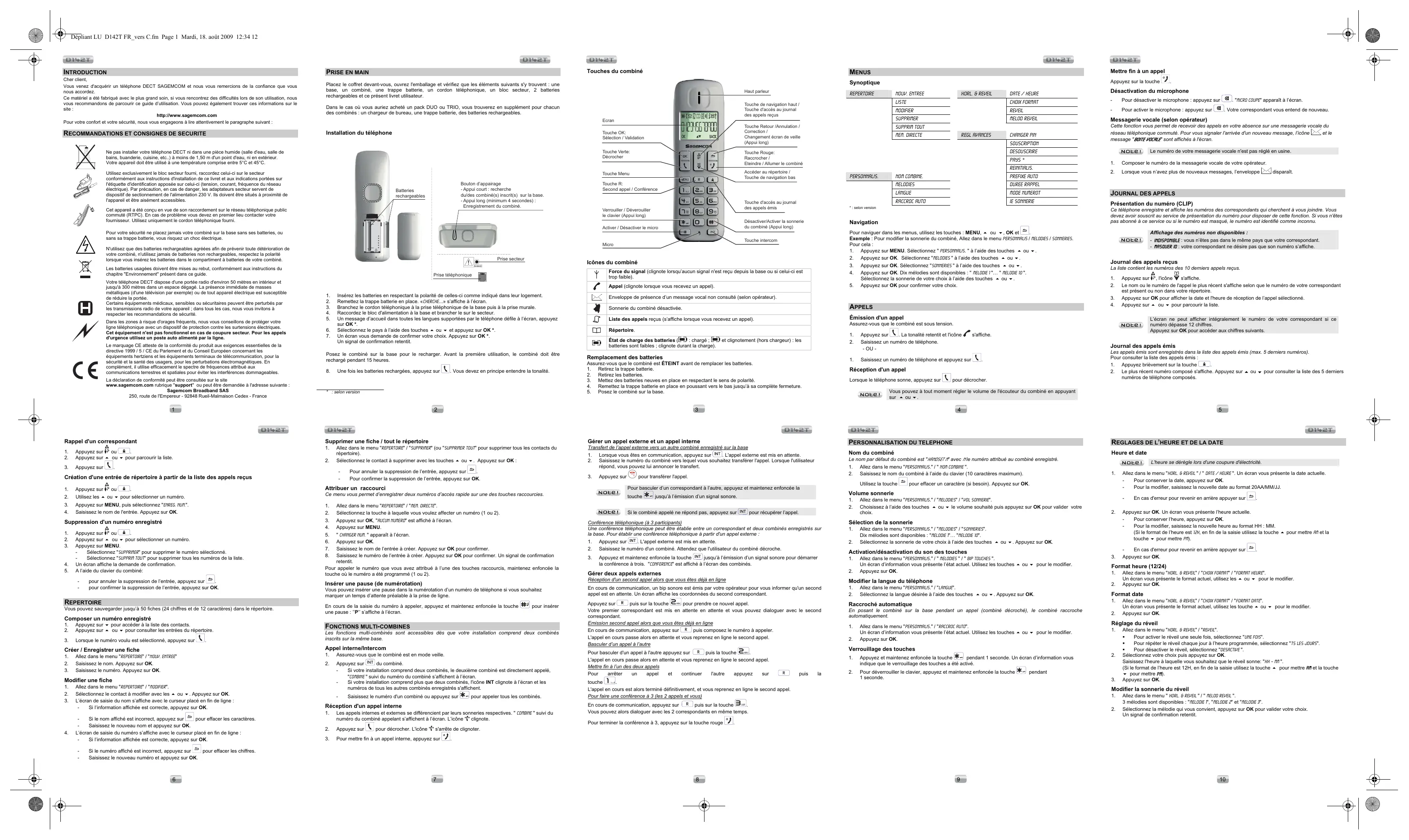 Cher client, Vous venez d'acquérir un téléphone DECT SAGEMCOM et nous vous remercions de la confiance que vous nous accordez. Ce matériel a été fabriqué avec le plus grand soin, si vous rencontrez des difficultés lors de son utilisation, nous vous recommandons de parcourir ce guide d’utilisation. Vous pouvez également trouver ces informations sur le site : http://www.sagemcom.com Pour votre confort et votre sécurité, nous vous engageons à lire attentivement le paragraphe suivant : Placez le coffret devant-vous, ouvrez l'emballage et vérifiez que les éléments suivants s'y trouvent : une base, un combiné, une trappe batterie, un cordon téléphonique, un bloc secteur, 2 batteries rechargeables et ce présent livret utilisateur. Haut parleur Dans le cas où vous auriez acheté un pack DUO ou TRIO, vous trouverez en supplément pour chacun des combinés : un chargeur de bureau, une trappe batterie, des batteries rechargeables. Touche de navigation haut / Touche d'accès au journal des appels reçus Touche Verte: Décrocher Ne pas installer votre téléphone DECT ni dans une pièce humide (salle d'eau, salle de bains, buanderie, cuisine, etc..) à moins de 1,50 m d'un point d'eau, ni en extérieur. Votre appareil doit être utilisé à une température comprise entre 5°C et 45°C. Utilisez exclusivement le bloc secteur fourni, raccordez celui-ci sur le secteur conformément aux instructions d'installation de ce livret et aux indications portées sur l'étiquette d'identification apposée sur celui-ci (tension, courant, fréquence du réseau électrique). Par précaution, en cas de danger, les adaptateurs secteur servent de dispositif de sectionnement de l'alimentation 230 V. Ils doivent être situés à proximité de l'appareil et être aisément accessibles. Bouton d’appairage - Appui court : recherche du/des combiné(s) inscrit(s) sur la base. - Appui long (minimum 4 secondes) : Enregistrement du combiné. Batteries rechargeables Accéder au répertoire / Touche de navigation bas