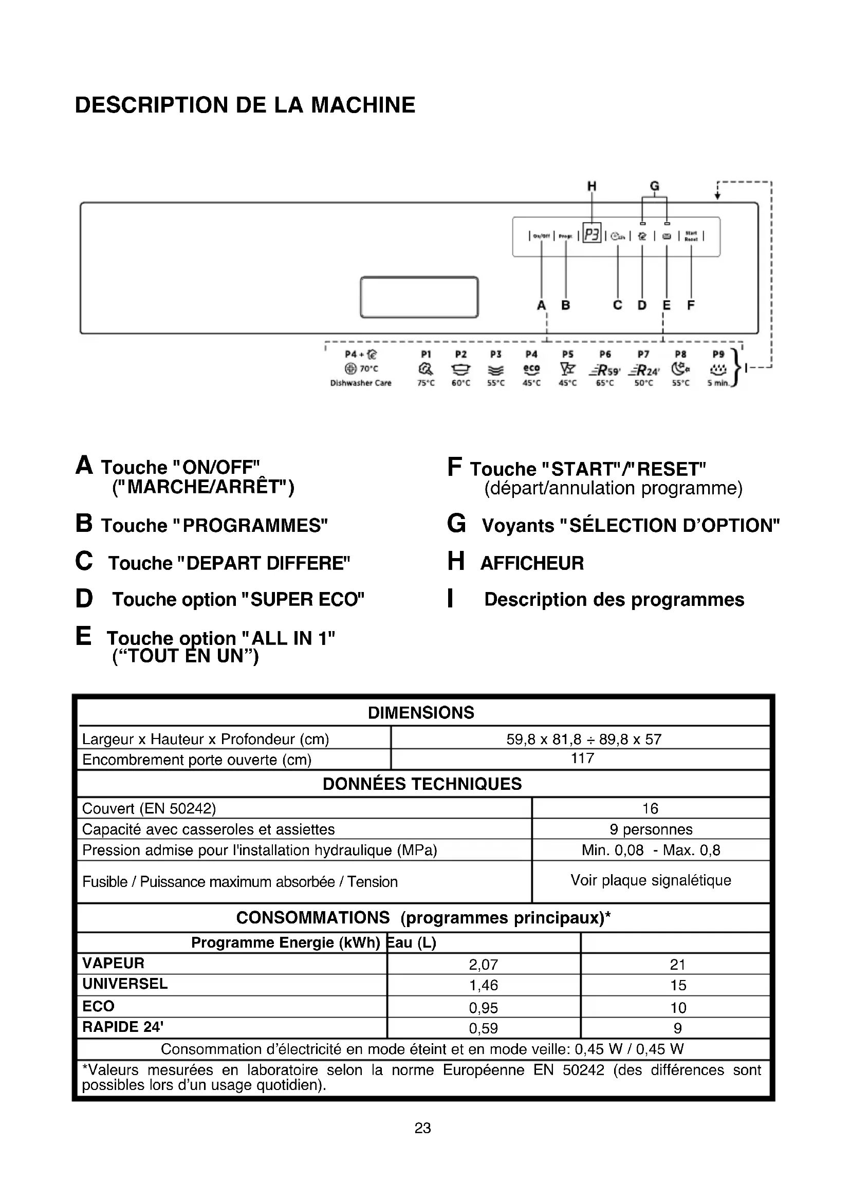 | Utilisation | Commandes électroniques, Affichage LED, Panier supérieur réglable, Panier à couverts amovible |