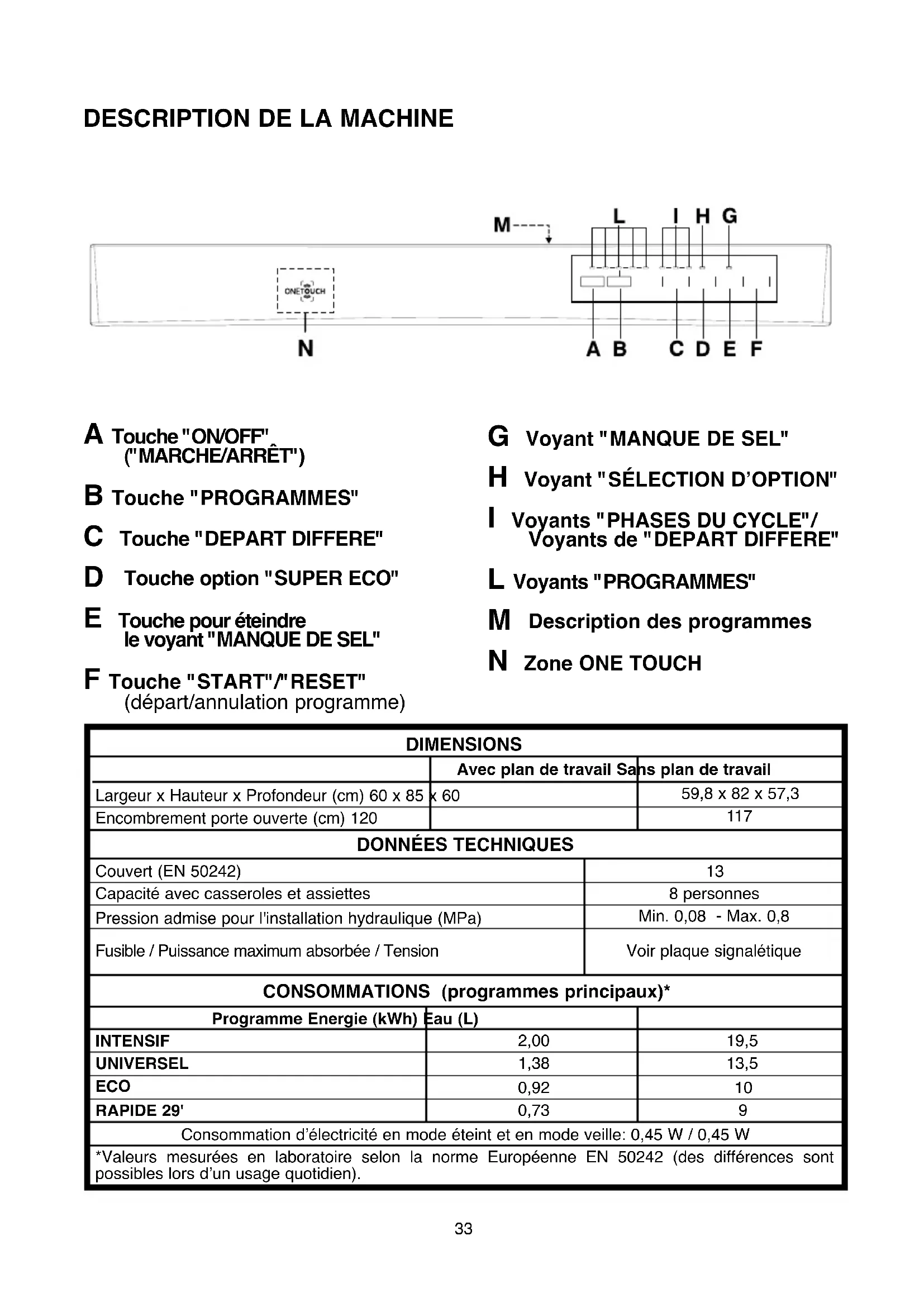 CONSOMMATIONS (programmes principaux)* Programme Energie (kWh) Eau (L) INTENSIF UNIVERSEL ECO RAPIDE 29' Largeur x Hauteur x Profondeur (cm) 60 x 85 x 60 Encombrement porte ouverte (cm) 120 Couvert (EN 50242) Capacité avec casseroles et assiettes Pression admise pour l'installation hydraulique (MPa) Fusible / Puissance maximum absorbée / Tension 8 personnes Min. 0,08 - Max. 0,8 Voir plaque signalétique Consommation d’électricité en mode éteint et en mode veille: 0,45 W / 0,45 W *Valeurs mesurées en laboratoire selon la norme Européenne EN 50242 (des différences sont possibles lors d’un usage quotidien). 59,8 x 82 x 57,3