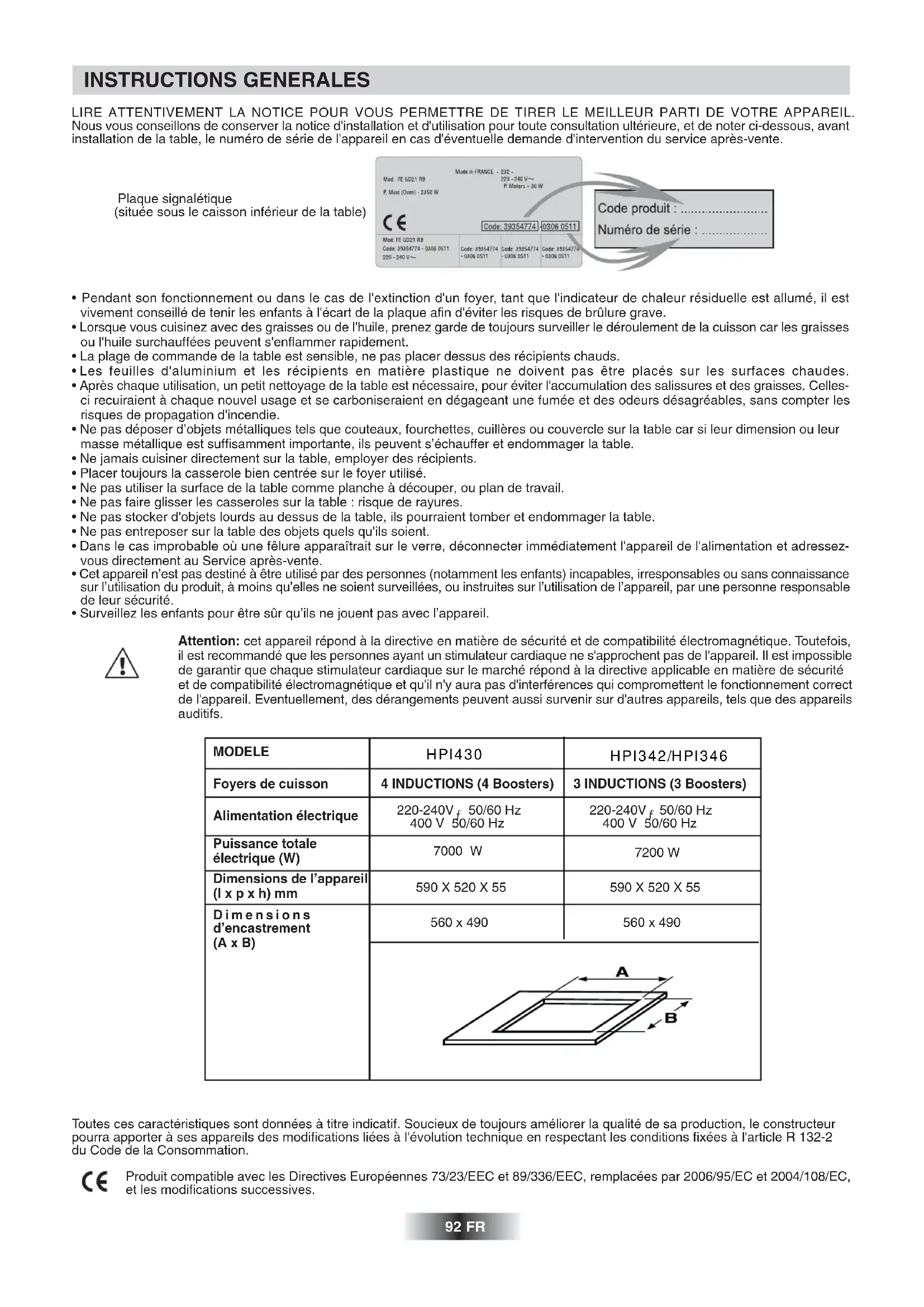- Surveillez les enfants pour être sûr qu’ils ne jouent pas avec l’appareil. Attention: cet appareil répond à la directive en matière de sécurité et de compatibilité électromagnétique. Toutefois, il est recommandé que les personnes ayant un stimulateur cardiaque ne s'approchent pas de l'appareil. Il est impossible de garantir que chaque stimulateur cardiaque sur le marché répond à la directive applicable en matière de sécurité et de compatibilité électromagnétique et qu'il n'y aura pas d'interférences qui compromettent le fonctionnement correct de l'appareil. Eventuellement, des dérangements peuvent aussi survenir sur d'autres appareils, tels que des appareils auditifs. Toutes ces caractéristiques sont données à titre indicatif. Soucieux de toujours améliorer la qualité de sa production, le constructeur pourra apporter à ses appareils des modifications liées à l'évolution technique en respectant les conditions fixées à l'article R 132-2 du Code de la Consommation. Produit compatible avec les Directives Européennes 73/23/EEC et 89/336/EEC, remplacées par 2006/95/EC et 2004/108/EC, et les modifications successives. MODELE Foyers de cuisson Alimentation électrique Puissance totale électrique (W) Dimensions de l’appareil (l x p x h) mm Dimensions d’encastrement (A x B) 3 INDUCTIONS (3 Boosters) 400 V 50/60 Hz 7000 W 590 X 520 X 55 560 x 490 4 INDUCTIONS (4 Boosters) 400 V 50/60 Hz 7200 W 590 X 520 X 55 560 x 490 92 FR HPI342/HPI346 HPI430 220-240V