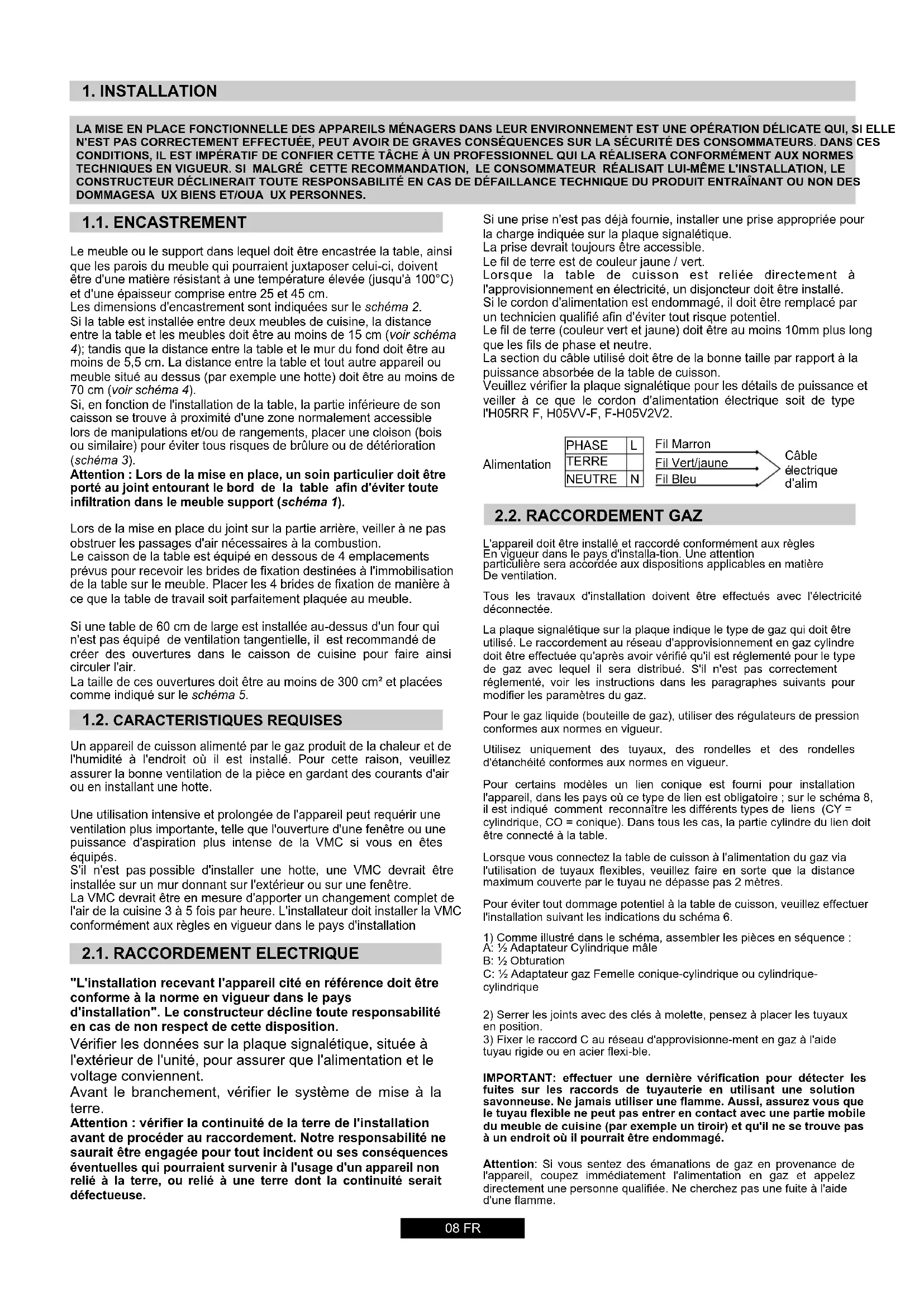 Le meuble ou le support dans lequel doit être encastrée la table, ainsi que les parois du meuble qui pourraient juxtaposer celui-ci, doivent être d'une matière résistant à une température élevée (jusqu'à 100°C) et d'une épaisseur comprise entre 25 et 45 cm. Les dimensions d'encastrement sont indiquées sur le schéma 2. Si la table est installée entre deux meubles de cuisine, la distance entre la table et les meubles doit être au moins de 15 cm (voir schéma 4); tandis que la distance entre la table et le mur du fond doit être au moins de 5,5 cm. La distance entre la table et tout autre appareil ou meuble situé au dessus (par exemple une hotte) doit être au moins de 70 cm (voir schéma 4). Si, en fonction de l'installation de la table, la partie inférieure de son caisson se trouve à proximité d'une zone normalement accessible lors de manipulations et/ou de rangements, placer une cloison (bois ou similaire) pour éviter tous risques de brûlure ou de détérioration (schéma 3). Attention : Lors de la mise en place, un soin particulier doit être porté au joint entourant le bord de la table afin d'éviter toute infiltration dans le meuble support (schéma 1). Lors de la mise en place du joint sur la partie arrière, veiller à ne pas obstruer les passages d'air nécessaires à la combustion. Le caisson de la table est équipé en dessous de 4 emplacements prévus pour recevoir les brides de fixation destinées à l'immobilisation de la table sur le meuble. Placer les 4 brides de fixation de manière à ce que la table de travail soit parfaitement plaquée au meuble. Si une table de 60 cm de large est installée au-dessus d'un four qui n'est pas équipé de ventilation tangentielle, il est recommandé de créer des ouvertures dans le caisson de cuisine pour faire ainsi circuler l'air. La taille de ces ouvertures doit être au moins de 300 cm² et placées comme indiqué sur le schéma 5. 08 FR LA MISE EN PLACE FONCTIONNELLE DES APPAREILS MÉNAGERS DANS LEUR ENVIRONNEMENT EST UNE OPÉRATION DÉLICATE QUI, SI ELLE N'EST PAS CORRECTEMENT EFFECTUÉE, PEUT AVOIR DE GRAVES CONSÉQUENCES SUR LA SÉCURITÉ DES CONSOMMATEURS. DANS CES CONDITIONS, IL EST IMPÉRATIF DE CONFIER CETTE TÂCHE À UN PROFESSIONNEL QUI LA RÉALISERA CONFORMÉMENT AUX NORMES TECHNIQUES EN VIGUEUR. SI MALGRÉ CETTE RECOMMANDATION, LE CONSOMMATEUR RÉALISAIT LUI-MÊME L'INSTALLATION, LE CONSTRUCTEUR DÉCLINERAIT TOUTE RESPONSABILITÉ EN CAS DE DÉFAILLANCE TECHNIQUE DU PRODUIT ENTRAÎNANT OU NON DES DOMMAGESA UX BIENS ET/OUA UX PERSONNES. 1.1. ENCASTREMENT 1.2. CARACTERISTIQUES REQUISES Un appareil de cuisson alimenté par le gaz produit de la chaleur et de l'humidité à l'endroit où il est installé. Pour cette raison, veuillez assurer la bonne ventilation de la pièce en gardant des courants d'air ou en installant une hotte. Une utilisation intensive et prolongée de l'appareil peut requérir une ventilation plus importante, telle que l'ouverture d'une fenêtre ou une puissance d'aspiration plus intense de la VMC si vous en êtes équipés. S'il n'est pas possible d'installer une hotte, une VMC devrait être installée sur un mur donnant sur l'extérieur ou sur une fenêtre. La VMC devrait être en mesure d'apporter un changement complet de l'air de la cuisine 3 à 5 fois par heure. L'installateur doit installer la VMC conformément aux règles en vigueur dans le pays d'installation PHASE TERRE NEUTRE