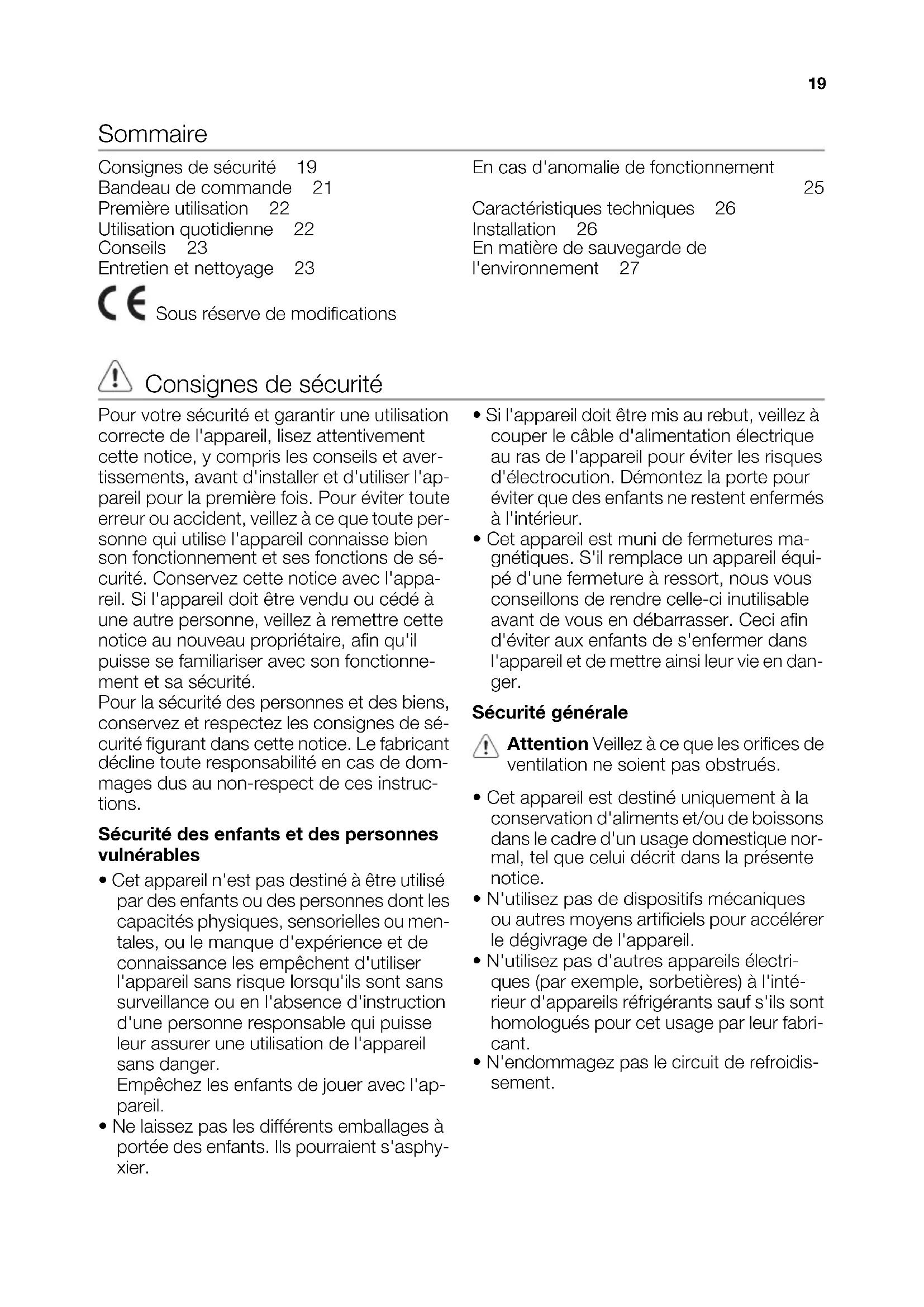 Caractéristiques techniques 26 Installation 26 En matière de sauvegarde de l'environnement 27 Sous réserve de modifications Consignes de sécurité Pour votre sécurité et garantir une utilisation correcte de l'appareil, lisez attentivement cette notice, y compris les conseils et aver- tissements, avant d'installer et d'utiliser l'ap- pareil pour la première fois. Pour éviter toute erreur ou accident, veillez à ce que toute per- sonne qui utilise l'appareil connaisse bien son fonctionnement et ses fonctions de sé- curité. Conservez cette notice avec l'appa- reil. Si l'appareil doit être vendu ou cédé à une autre personne, veillez à remettre cette notice au nouveau propriétaire, afin qu'il puisse se familiariser avec son fonctionne- ment et sa sécurité. Pour la sécurité des personnes et des biens, conservez et respectez les consignes de sé- curité figurant dans cette notice. Le fabricant décline toute responsabilité en cas de dom- mages dus au non-respect de ces instruc- tions. Sécurité des enfants et des personnes vulnérables