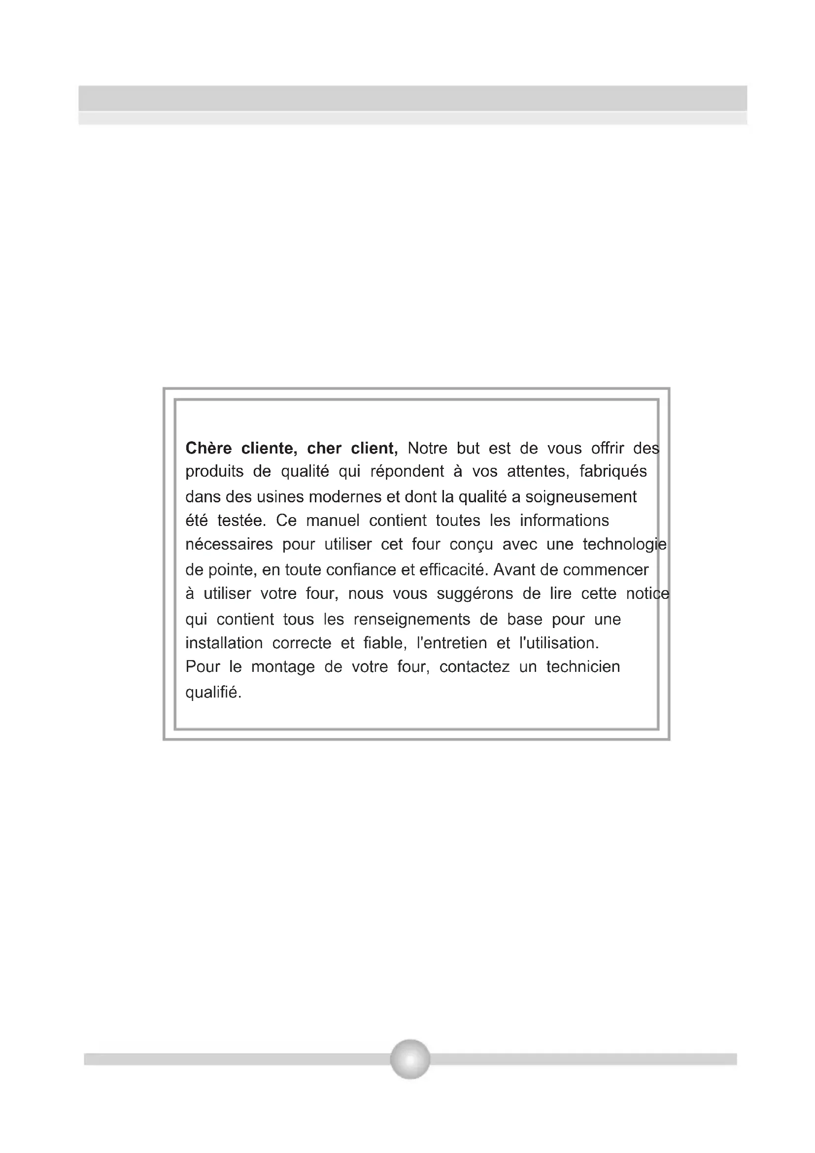 FMV-A56B MK2Chère cliente, cher client, Notre but est de vous offrir des produits de qualité qui répondent à vos attentes, fabriqués dans des usines modernes et dont la qualité a soigneusement été testée. Ce manuel contient toutes les informations nécessaires pour utiliser cet four conçu avec une technologie de pointe, en toute confiance et efficacité. Avant de commencer à utiliser votre four, nous vous suggérons de lire cette notice qui contient tous les renseignements de base pour une installation correcte et fiable, l'entretien et l'utilisation. Pour le montage de votre four, contactez un technicien qualifié.1 Table des matières 1-Présentation et dimensions du four 2-Avertissements 3-Préparation pour l'installation et l'utilisation 4-Utilisation du four 5-Nettoyage et entretien du four 6-Service après-vente et transport2