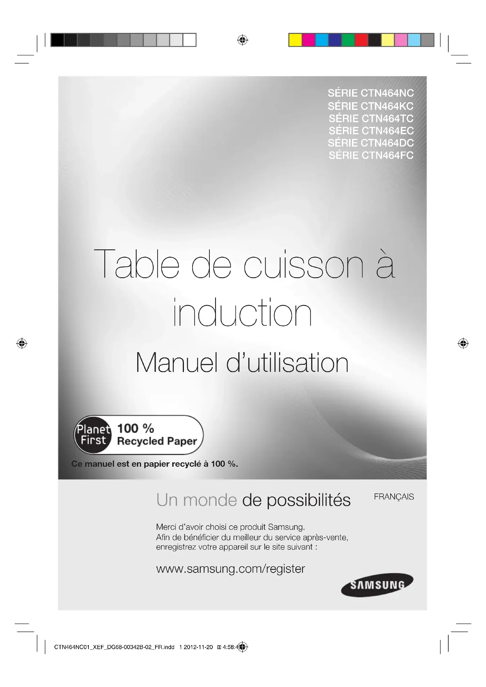 FRANÇAISCe manuel est en papier recyclé à 100 %.CTN464NC01_XEF_DG68-00342B-02_FR.indd 1 2012-11-20 4:58:472_ Utilisation de ce manuel Utilisation de ce manuel Avant d'utiliser l'appareil, veuillez lire attentivement toutes les instructions et notamment les consignes de sécurité figurant dans la section suivante. Conservez soigneusement ce manuel en vue d'une consultation ultérieure. Remettez-le au propriétaire suivant en cas de vente.