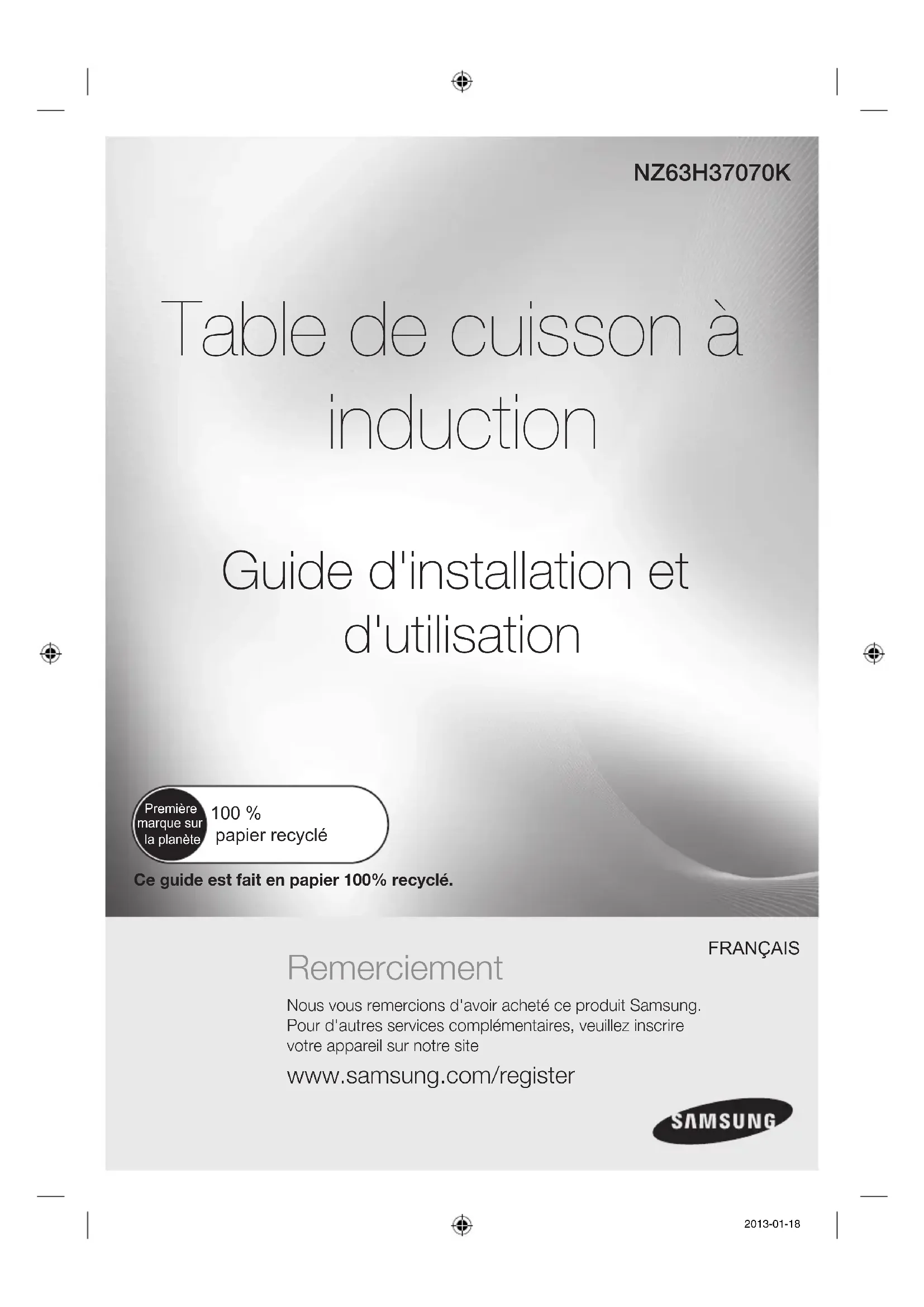 www.samsung.com/register Table de cuisson à induction Guide d'installation et d'utilisation FRANÇAIS 2013-01-18 NZ63H37070K Ce guide est fait en papier 100% recyclé. Première marque sur la planète100 % papier recycléNous vous remercions d'avoir acheté ce produit Samsung. Pour d'autres services complémentaires, veuillez inscrire votre appareil sur notre site RemerciementAvant d'utiliser votre appareil, veuillez lire attentivement ce guide d'installation et d'utilisation, et faire surtout attention aux informations de sécurité, qui figurent dans la partie suivante. Gardez ce guide comme document de référence. Au cas où la possession de l'appareil serait cédée à un autre particulier, veuillez lui transmettre en même temps ce guide. 2013-01-18 Utilisation de ce guide Marques de sécurité et précautions Dans ce guide, vous trouverez les marques de sécurité suivantes: Avertissement Opérations risquées ou dangereuses qui pourraient conduire aux blessures graves ou mortelles. Attention Opérations risquées ou dangereuses qui pourraient conduire aux blessures légères ou aux dégâts matériels. Attention Lors de la cuisson, prenez ces mesures de précaution de base afin d'éviter incendie, explosion, commotion électrique, ou blessure. Ne pas essayer de faire cela. Ne pas démonter l'appareil. Ne pas toucher. Suivre strictement les consignes. Débrancher l'appareil de la prise. Assurez-vous que l'appareil est mis à la terre afin d'éviter la commotion électrique. Appelez le centre de services pour demander des aides. Note Important 2_utilisation de ce guide2013-01-18AvertissementAvertissement 3consignes de sécurité_ Consignes de sécurité Les caractéristiques de sécurité de l'appareil sont conformes aux normes techniques en vigueur. Pourtant, en tant que fabricant, nous considérons comme notre responsabilité de vous familiariser aux consignes suivantes. Sécurité en électricité Assurez-vous que l'appareil est correctement installé et mis à la terre par un technicien qualifié. Les éventuelles réparations de votre appareil doivent être effectuées par un professionnel qualifié. Les réparations faites par une personne incompétente pourraient causer des blessures ou des pannes sérieuses. Si votre appareil nécessite des réparations, veuillez prendre contact avec le centre de services local. Le fait de ne pas suivre ces consignes causerait des dégâts et annulera la garantie. L'appareil ne doit être utilisé qu'après avoir été correctement installé dans un endroit dont les conditions sont conformes aux normes applicables. Cela pour assurer une protection nécessaire contre la commotion requise par les normes en vigueur. En cas de non fonctionnement, cassure, fêlure ou fissure: - éteignez immédiatement toutes les zones de cuisson; - déconnectez la table de l'alimentation électrique; et - prenez contact avec le centre de services local. Sécurité enfant Cette table de cuisson n'est pas prévue pour être utilisée par des enfants ou des personnes invalides, sauf s'ils sont surveillés par un adulte responsable de leur sécurité. Il faut surveiller les enfants pour s'assurer qu'ils ne jouent pas avec l'appareil. Les zones de cuisson s'échauffent quand vous les utilisez. Il convient de garder les petits enfants loin de l'appareil. Consignes de sécurité2013-01-18 4_consignes de sécurité