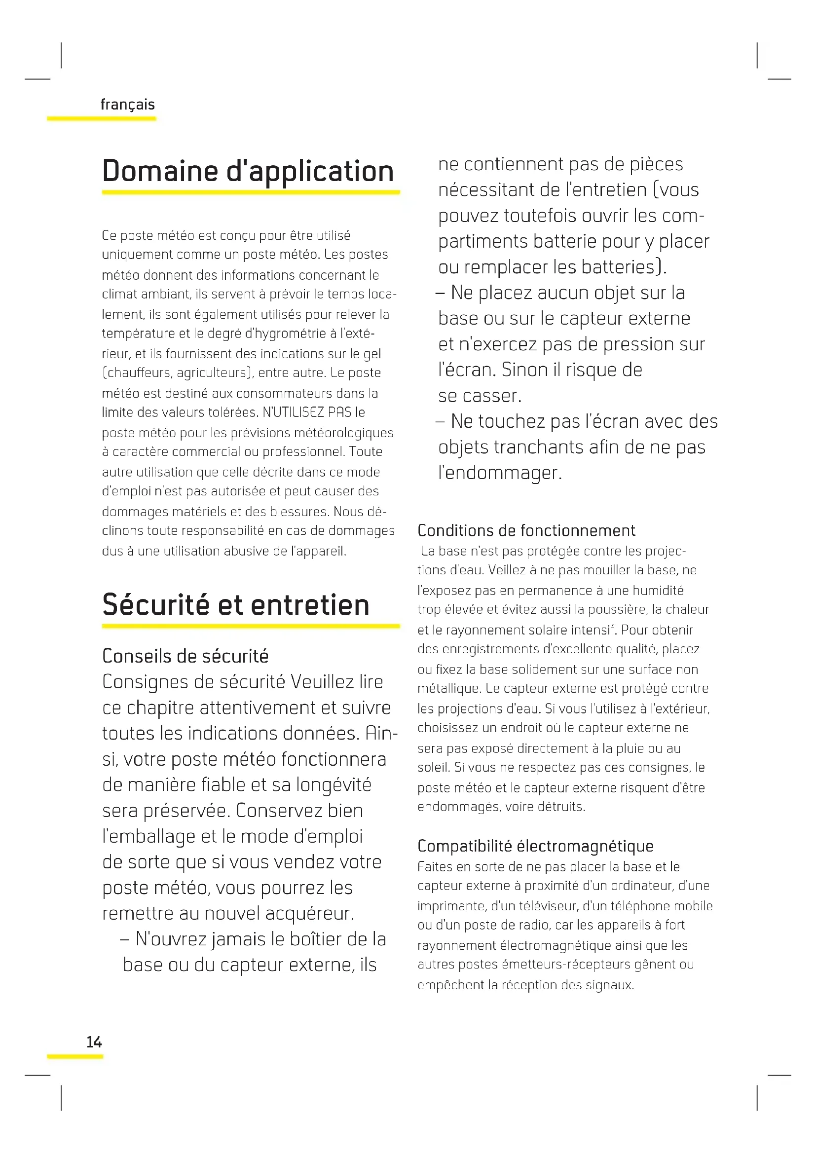 EN 300 330-2 EN 301 489-1 EN 301 489-3 Garantie Die MIGROS übernimmt während zwei Jahren seit Kaufabschluss die Garantie für Mängelfreiheit und Funktionsfähigkeit des von Ihnen erworbenen Gegenstandes. Die MIGROS kann die Garantie- leistung wahlweise durch kostenlose Reparatur, gleichwertigen Ersatz oder durch Rückerstattung des Kaufpreises erbringen. Weitere Ansprüche sind ausgeschlossen. Nicht unter die Garantie fallen normale Abnützung sowie die Folgen unsachgemässer Behandlung oder Beschädigung durch den Käufer oder Dritt- personen sowie Mängel, die auf äussere Umstän- de zurückzuführen sind. Die Garantieverpflichtung erlischt bei Reparaturen durch nicht MIGROS-autorisierte Servicestellen. Garantieschein oder Kaufnachweis (Kassabon, Rechnung) bitte sorgfältig aufbewahren. Bei Fehlen desselben wird jeder Garantieanspruch hinfällig. Reparatur- oder pflegebedürftige Geräte werden in jeder Verkaufsstelle entgegengenommen. Haben Sie weitere Fragen? Die M-Infoline hilft Ihnen gerne weiter unter der Tel.-Nr.: 0800 84 0848 von Montag bis Freitag 08.00 – 18.30 Uhr (8 Rp. / Min. von 08.00 – 17.00 Uhr, 4 Rp. / Min von 17.00 – 18.30 Uhr). E-Mail: m-infoline@mgb.ch14 français Domaine d'application Ce poste météo est conçu pour être utilisé uniquement comme un poste météo. Les postes météo donnent des informations concernant le climat ambiant, ils servent à prévoir le temps loca- lement, ils sont également utilisés pour relever la température et le degré d'hygrométrie à l'exté- rieur, et ils fournissent des indications sur le gel (chauffeurs, agriculteurs), entre autre. Le poste météo est destiné aux consommateurs dans la limite des valeurs tolérées. N'UTILISEZ PAS le poste météo pour les prévisions météorologiques à caractère commercial ou professionnel. Toute autre utilisation que celle décrite dans ce mode d'emploi n'est pas autorisée et peut causer des dommages matériels et des blessures. Nous dé- clinons toute responsabilité en cas de dommages dus à une utilisation abusive de l'appareil. Sécurité et entretien Conseils de sécurité Consignes de sécurité Veuillez lire ce chapitre attentivement et suivre toutes les indications données. Ain- si, votre poste météo fonctionnera de manière fiable et sa longévité sera préservée. Conservez bien l'emballage et le mode d'emploi de sorte que si vous vendez votre poste météo, vous pourrez les remettre au nouvel acquéreur. – N'ouvrez jamais le boîtier de la base ou du capteur externe, ils ne contiennent pas de pièces nécessitant de l'entretien (vous pouvez toutefois ouvrir les com- partiments batterie pour y placer ou remplacer les batteries). – Ne placez aucun objet sur la base ou sur le capteur externe et n'exercez pas de pression sur l'écran. Sinon il risque de se casser. – Ne touchez pas l'écran avec des objets tranchants afin de ne pas l'endommager. Conditions de fonctionnement La base n'est pas protégée contre les projec- tions d'eau. Veillez à ne pas mouiller la base, ne l'exposez pas en permanence à une humidité trop élevée et évitez aussi la poussière, la chaleur et le rayonnement solaire intensif. Pour obtenir des enregistrements d'excellente qualité, placez ou fixez la base solidement sur une surface non métallique. Le capteur externe est protégé contre les projections d'eau. Si vous l'utilisez à l'extérieur, choisissez un endroit où le capteur externe ne sera pas exposé directement à la pluie ou au soleil. Si vous ne respectez pas ces consignes, le poste météo et le capteur externe risquent d'être endommagés, voire détruits. Compatibilité électromagnétique Faites en sorte de ne pas placer la base et le capteur externe à proximité d'un ordinateur, d'une imprimante, d'un téléviseur, d'un téléphone mobile ou d'un poste de radio, car les appareils à fort rayonnement électromagnétique ainsi que les autres postes émetteurs-récepteurs gênent ou empêchent la réception des signaux.15 français Batteries (compris dans la livraison) Votre base et le capteur externe fonctionnent avec chacun deux batteries AA de 1,5V. Voici quelques consignes pour manipuler les batteries : Lorsque vous remplacez les batteries, utilisez uniquement des batteries de même modèle. Les batteries ne doivent pas être rechargées ni réac- tivées avec d'autres agents, être ouvertes, jetées dans le feu ou mises en court-circuit. Conservez toujours les batteries hors de la portée des en- fants. Si elles sont avalées, les batteries peuvent être dangereuses. Par conséquent, conservez les batteries et le poste météo hors de portée des jeunes enfants. Si un enfant avale une batterie, vous devez consulter un médecin immédiate- ment. Les batteries ne supportent pas la chaleur. Evitez d'exposer la base ou le capteur externe à une chaleur intense afin d'éviter toute sur- chauffe des batteries placées à l'intérieur. Si ces consignes ne sont pas respectées, les batteries risquent d'être endommagées, voire d'exploser. Si la température est constamment au-dessous de 0°C, la durée de vie des batteries risque d'être écourtée. Remarque Placez le capteur externe de sorte qu'il ne soit pas exposé à une chaleur ou à un froid extrême. Lorsque le froid est extrême, les batteries et par conséquent le signal émetteur sont affaiblis. Nous vous recommandons de ne pas utiliser le poste météo avec un accumulateur, mais avec des batteries. Mise en service Avant de mettre en service le poste météo, nous vous recommandons de lire attentivement le mode d'emploi. Pour mettre l'appareil en service, utilisez une table, où vous pourrez mettre la base et le capteur externe côte à côte. Pour pouvoir mettre le poste météo en service, veuillez retirer le film de protection de l'écran de la base. Attention Ce film de protection présente un risque d'étouf- fement et doit être maintenu hors de portée des jeunes enfants et des nourrissons! Retirez 