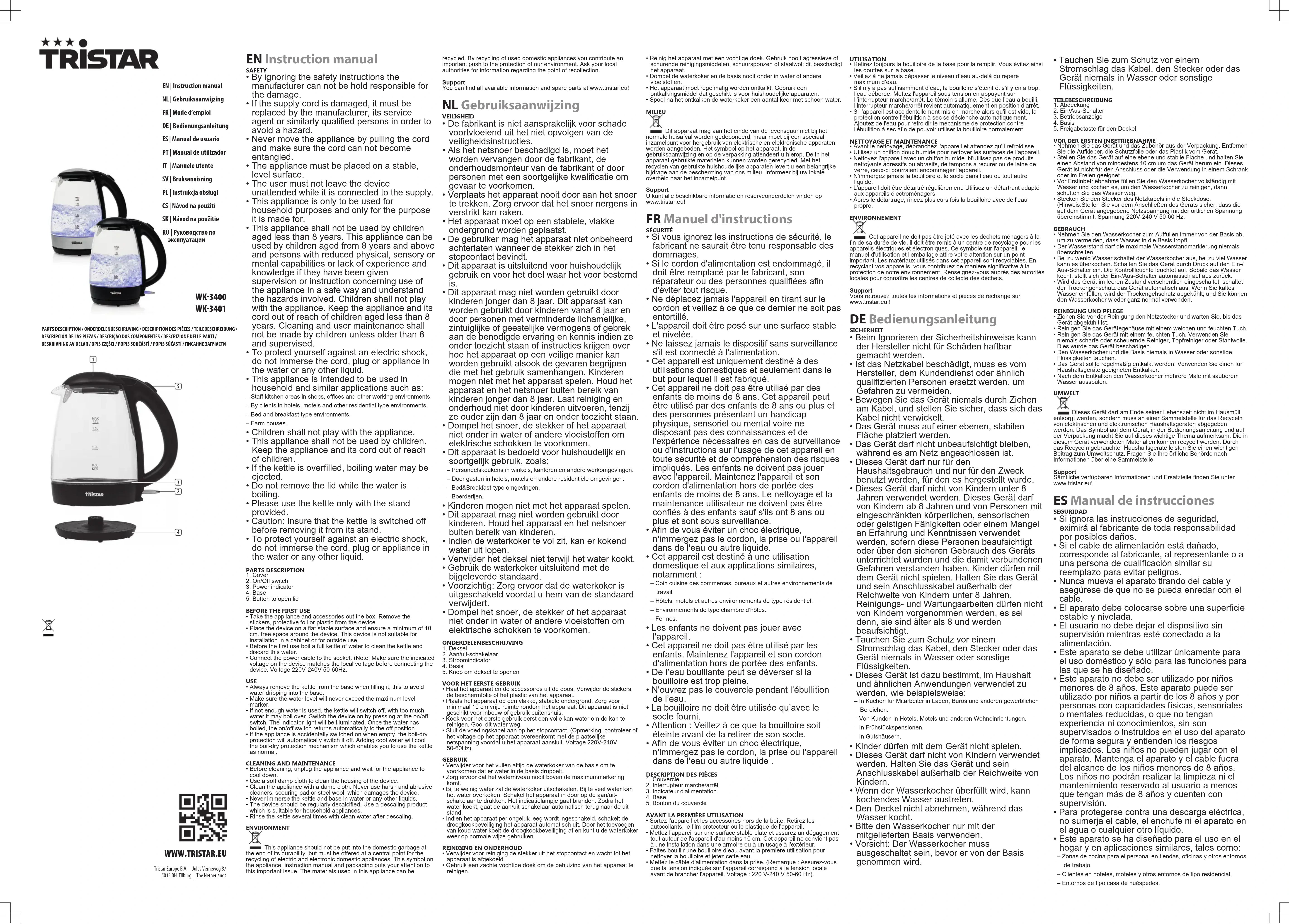 WK3401 - Bouilloire TRISTAR - Notice d'utilisation et mode d'emploi gratuit