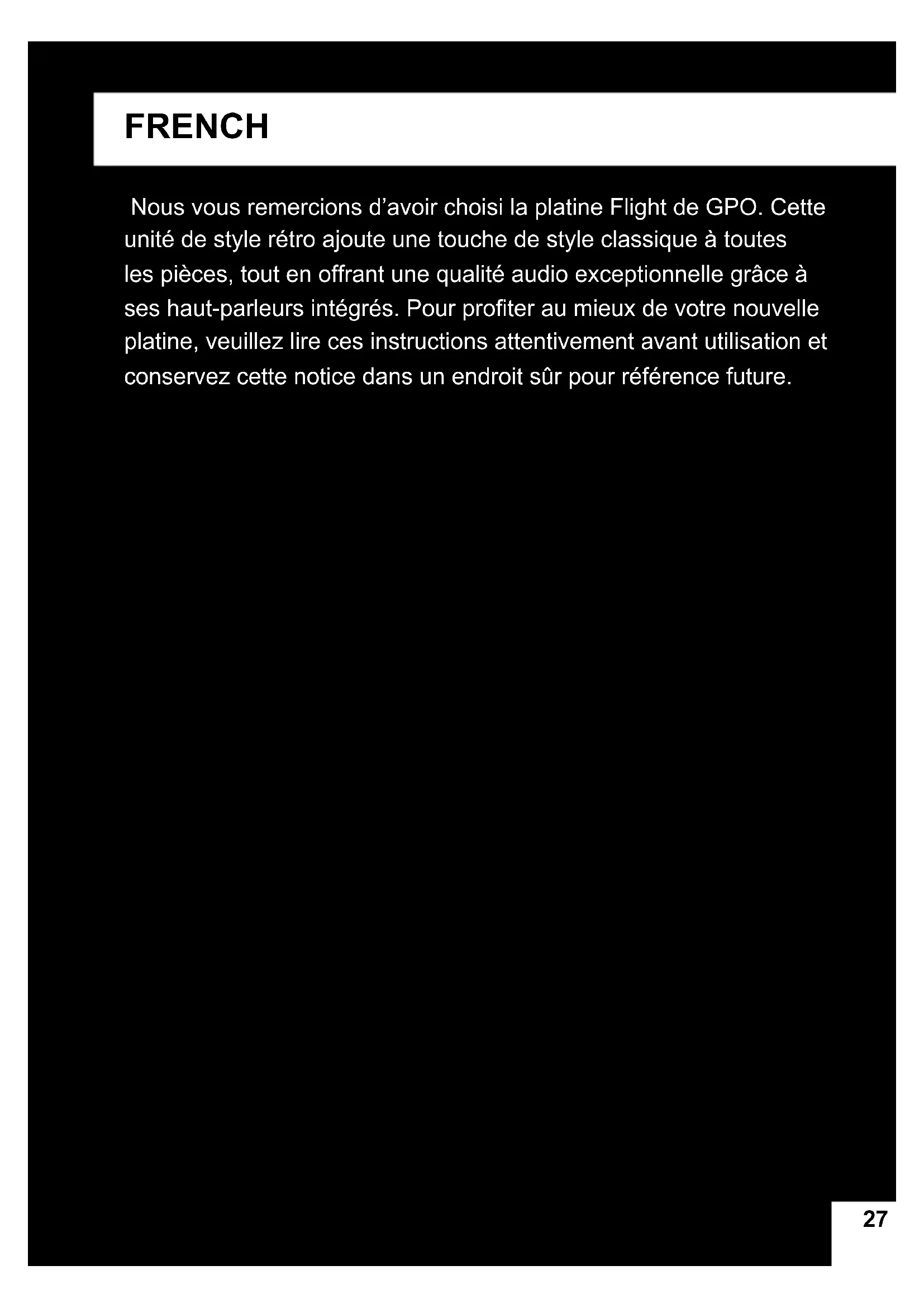 - Das Gerät nach Gebrauch abschalten und den Netzstecker ziehen. PRODUKTSUPPORT Für weitere Beratung oder Betreuung siehe www.gporetro.com. Hinweis: Zur eigenen Sicherheit sollten Sie das Gerätegehäuse NICHT selbstständig öffnen. Durch Öffnen des Gehäuses erlischt Ihre Garantie. Zudem benden sich keine vom Benutzer zu wartenden Teile innerhalb des Geräts.2727 FRENCH Nous vous remercions d’avoir choisi la platine Flight de GPO. Cette unité de style rétro ajoute une touche de style classique à toutes les pièces, tout en offrant une qualité audio exceptionnelle grâce à ses haut-parleurs intégrés. Pour proter au mieux de votre nouvelle platine, veuillez lire ces instructions attentivement avant utilisation et conservez cette notice dans un endroit sûr pour référence future.28 DÉBALLAGE Cet ensemble comprend : 1x Platine Flight 1x aiguille de platine (installée) 1x couvre-plateau en caoutchouc pour platine (placé sur la platine) 1x Câble d’alimentation CC 1x Câble RCA 1x Manuel Sortez avec précaution l’ensemble du contenu de l’emballage. As- surez-vous de conserver et de ranger ce manuel pour référence future. Lors du choix de l’emplacement de l’unité, évitez les plans inclinés, la lumière directe du soleil ou les sources de chaleur et l’humidité. Gardez les trous de ventilation dégagés et ne placez aucun équipe- ment sur l’unité, car ceci peut entraîner des dommages. Retirez seulement la protection du stylet de l’ensemble du stylet lors de l’utilisation. Laisser la protection en place lors du rangement permet de protéger votre stylet de dommages.29 CARACTÉRISTIQUES