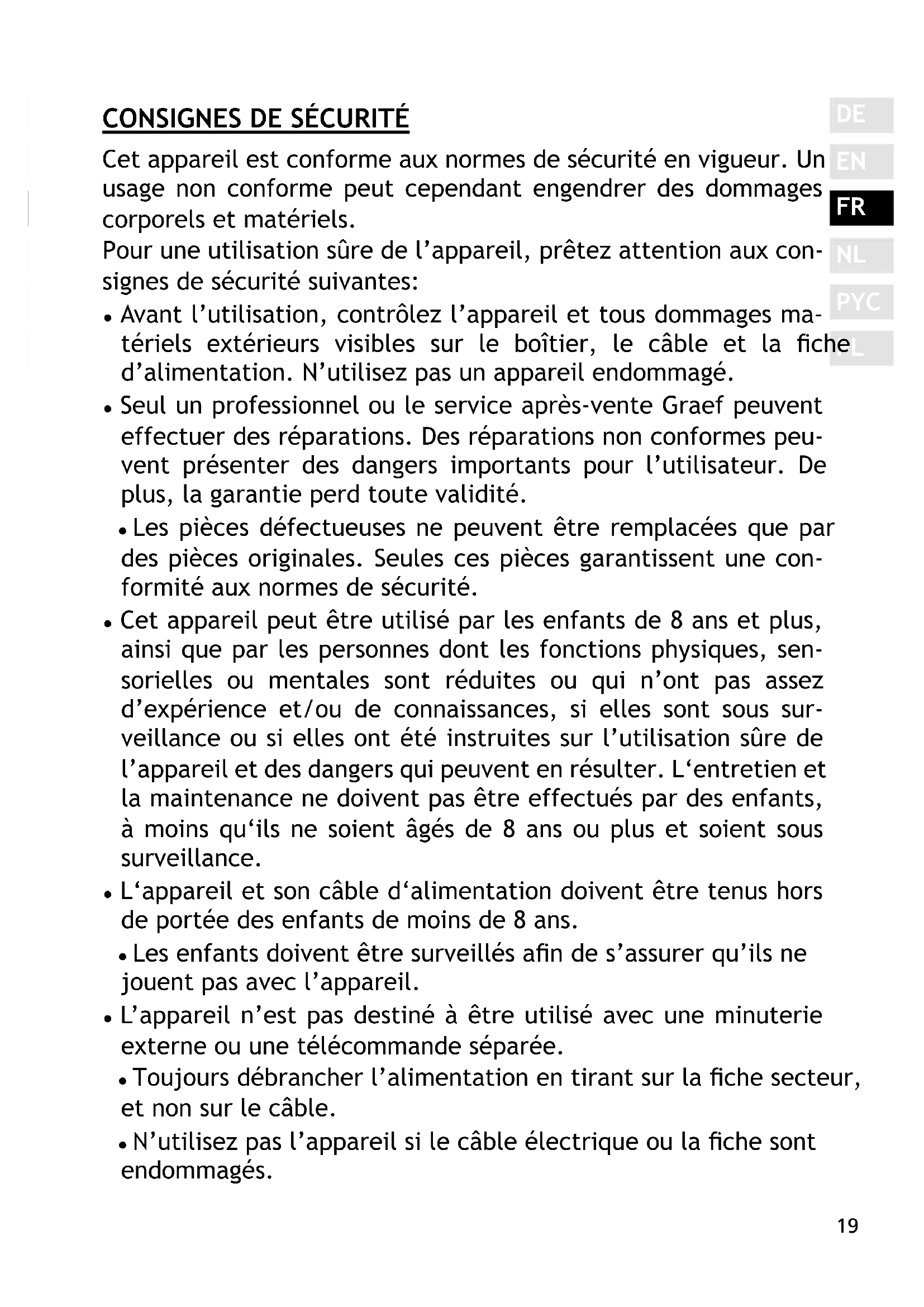 Cet appareil est conforme aux normes de sécurité en vigueur. Un usage non conforme peut cependant engendrer des dommages corporels et matériels. Pour une utilisation sûre de l’appareil, prêtez attention aux con- signes de sécurité suivantes: ● Avant l’utilisation, contrôlez l’appareil et tous dommages ma- tériels extérieurs visibles sur le boîtier, le câble et la che d’alimentation. N’utilisez pas un appareil endommagé. ● Seul un professionnel ou le service après-vente Graef peuvent effectuer des réparations. Des réparations non conformes peu- vent présenter des dangers importants pour l’utilisateur. De plus, la garantie perd toute validité. ● Les pièces défectueuses ne peuvent être remplacées que par des pièces originales. Seules ces pièces garantissent une con- formité aux normes de sécurité. ● Cet appareil peut être utilisé par les enfants de 8 ans et plus, ainsi que par les personnes dont les fonctions physiques, sen- sorielles ou mentales sont réduites ou qui n’ont pas assez d’expérience et/ou de connaissances, si elles sont sous sur- veillance ou si elles ont été instruites sur l’utilisation sûre de l’appareil et des dangers qui peuvent en résulter. L‘entretien et la maintenance ne doivent pas être effectués par des enfants, à moins qu‘ils ne soient âgés de 8 ans ou plus et soient sous surveillance. ● L‘appareil et son câble d‘alimentation doivent être tenus hors de portée des enfants de moins de 8 ans. ● Les enfants doivent être surveillés an de s’assurer qu’ils ne jouent pas avec l’appareil. ● L’appareil n’est pas destiné à être utilisé avec une minuterie externe ou une télécommande séparée. ● Toujours débrancher l’alimentation en tirant sur la che secteur, et non sur le câble. ● N’utilisez pas l’appareil si le câble électrique ou la che sont endommagés.20 ● Avant de continuer à utiliser l’appareil, faites installer un nou- veau câble d’alimentation par le fabricant, son service après- vente ou par un spécialiste agréé an de prévenir tout danger. ● N’ouvrez en aucun cas le boîtier de l’appareil. En cas de contact avec des ls sous tension, ou de changement dans la construc- tion électrique ou mécanique, il y a risque de choc électrique. ● Ne touchez jamais les éléments sous tension. Ceux-ci peuvent engendrer un choc électrique, et même causer la mort. ● Avant de brancher l’appareil, comparez les données d’alimentation inscrites sur la plaque d’identication (tension et fréquence) à celles de votre réseau électrique. Les données doivent correspondre an d’éviter d’endommager l’appareil. ● Veillez à ce que le câble électrique ne pende pas, ce qui pour- rait provoquer la chute de l‘appareil. ● Les matériaux d’emballage ne doivent pas être utilisés pour jouer. Il y a risque de suffocation. ● Ne pas remplir la bouilloire au-dessus de la marque supérieure. Un débordement de l‘eau pourrait provoquer des blessures. ● N‘ouvrez pas le couvercle pendant que l‘eau chauffe. ● Evitez de toucher la paroi extérieure de l‘appareil, car elle peut devenir très chaude. ● Ne jamais plonger l‘appareil ou le socle dans l‘eau ou tout au- tre liquide. ● Tenez l‘appareil uniquement par la poignée. ● Veillez à ce que l‘appareil contienne toujours sufsamment d‘eau (le fond doit être recouvert) an d‘éviter un fonctionne- ment à sec. ● Ne jamais utiliser l‘appareil à proximité d‘une source de cha- leur. ● Ne jamais utiliser l‘appareil en plein air et gardez-le toujours dans un endroit sec. ● Ne jamais utiliser l‘appareil dans la salle de bain. ● La prise doit être débranchée lors du remplissage, après chaque utilisation ainsi qu‘avant de nettoyer l‘appareil. ● L‘appareil ne doit être utilisée qu‘avec le socle fourni. Ne ja-21