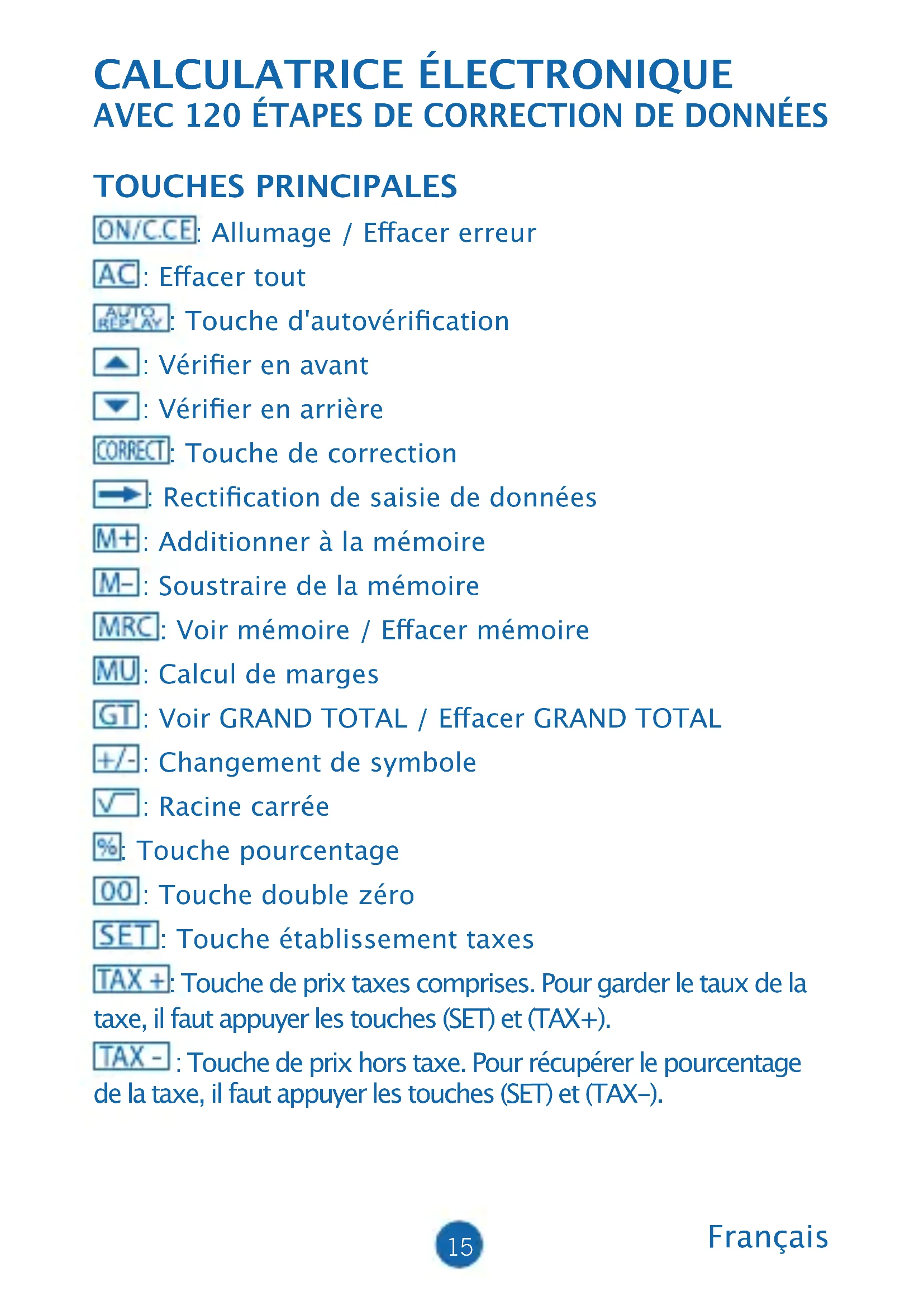 remove it. (2) Use a screwdriver or an adequate tool to push out the battery. (Note: follow the exit direction in pushing out). *Be careful not to damage the circuit. EXIT (3) Push in the new battery in the opposite direction (please note that battery in the + polarity should face up). (4) Put the cover back and tighten the screw (do not overdo). (5) Auto power-o: After approximately 8 minutes.15 Français CALCULATRICE ÉLECTRONIQUE AVEC 120 ÉTAPES DE CORRECTION DE DONNÉES TOUCHES PRINCIPALES : Allumage / Eacer erreur : Eacer tout : Touche d'autovérication : Vérier en avant : Vérier en arrière : Touche de correction : Rectication de saisie de données : Additionner à la mémoire : Soustraire de la mémoire : Voir mémoire / Eacer mémoire : Calcul de marges : Voir GRAND TOTAL / Eacer GRAND TOTAL : Changement de symbole : Racine carrée : Touche pourcentage : Touche double zéro : Touche établissement taxes : Touche de prix taxes comprises. Pour garder le taux de la taxe, il faut appuyer les touches (SET) et (TAX+). : Touche de prix hors taxe. Pour récupérer le pourcentage de la taxe, il faut appuyer les touches (SET) et (TAX-).16 DESCRIPTION DES SÉLECTEURS :