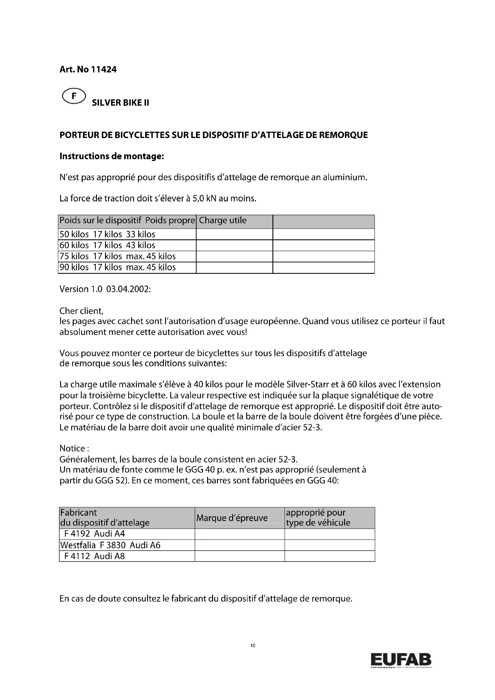 PORTEUR DE BICYCLETTES SUR LE DISPOSITIF D’ATTELAGE DE REMORQUE Instructions de montage: N’est pas approprié pour des dispositifis d’attelage de remorque an aluminium. La force de traction doit s’élever à 5,0 kN au moins. Poids sur le dispositif Poids propre Charge utile 50 kilos 17 kilos 33 kilos 60 kilos 17 kilos 43 kilos 75 kilos 17 kilos max. 45 kilos 90 kilos 17 kilos max. 45 kilos Version 1.0 03.04.2002: Cher client, les pages avec cachet sont l’autorisation d’usage européenne. Quand vous utilisez ce porteur il faut absolument mener cette autorisation avec vous! Vous pouvez monter ce porteur de bicyclettes sur tous les dispositifs d’attelage de remorque sous les conditions suivantes: La charge utile maximale s’élève à 40 kilos pour le modèle Silver-Starr et à 60 kilos avec l’extension pour la troisième bicyclette. La valeur respective est indiquée sur la plaque signalétique de votre porteur. Contrôlez si le dispositif d’attelage de remorque est approprié. Le dispositif doit être auto- risé pour ce type de construction. La boule et la barre de la boule doivent être forgées d’une pièce. Le matériau de la barre doit avoir une qualité minimale d’acier 52-3. Notice : Généralement, les barres de la boule consistent en acier 52-3. Un matériau de fonte comme le GGG 40 p. ex. n’est pas approprié (seulement à partir du GGG 52). En ce moment, ces barres sont fabriquées en GGG 40: