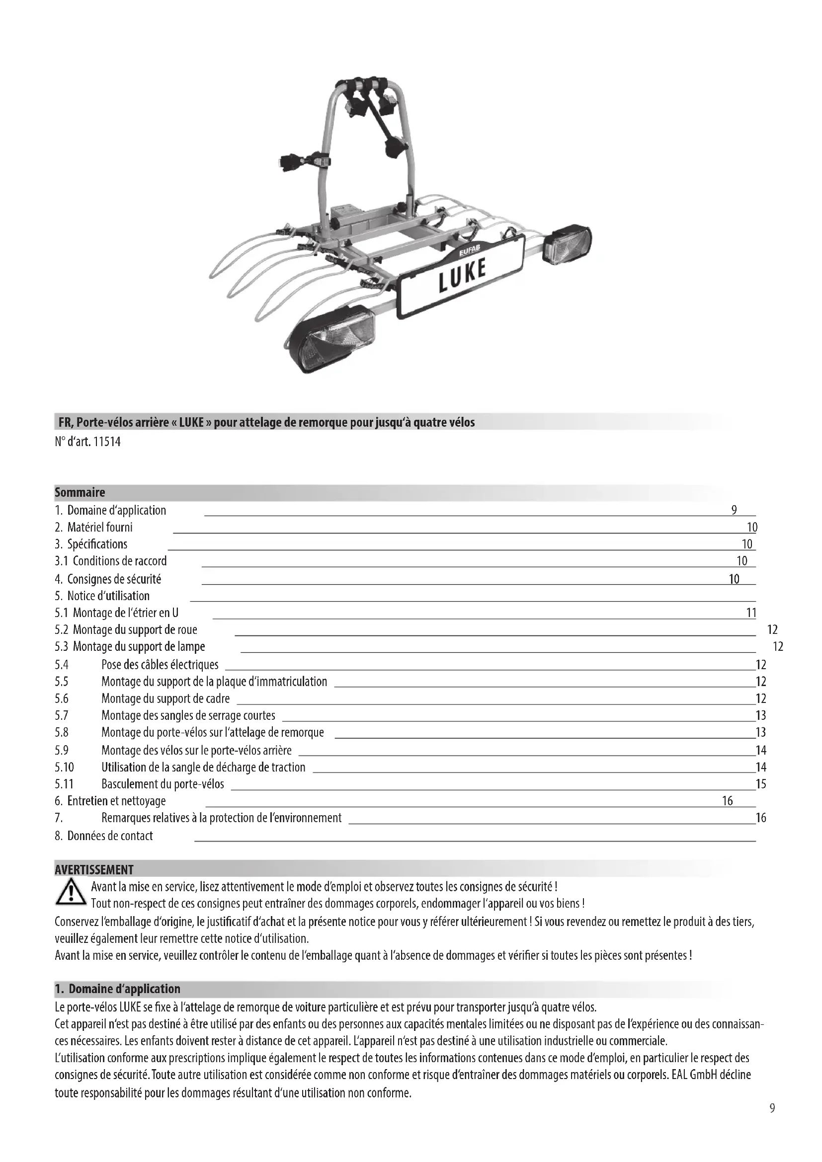 Le porte-vélos LUKE se xe à l‘attelage de remorque de voiture particulière et est prévu pour transporter jusqu‘à quatre vélos. Cet appareil n‘est pas destiné à être utilisé par des enfants ou des personnes aux capacités mentales limitées ou ne disposant pas de l‘expérience ou des connaissan- ces nécessaires. Les enfants doivent rester à distance de cet appareil. L‘appareil n‘est pas destiné à une utilisation industrielle ou commerciale. L‘utilisation conforme aux prescriptions implique également le respect de toutes les informations contenues dans ce mode d‘emploi, en particulier le respect des consignes de sécurité. Toute autre utilisation est considérée comme non conforme et risque d‘entraîner des dommages matériels ou corporels. EAL GmbH décline toute responsabilité pour les dommages résultant d‘une utilisation non conforme. FR, Porte-vélos arrière « LUKE » pour attelage de remorque pour jusqu‘à quatre vélos10