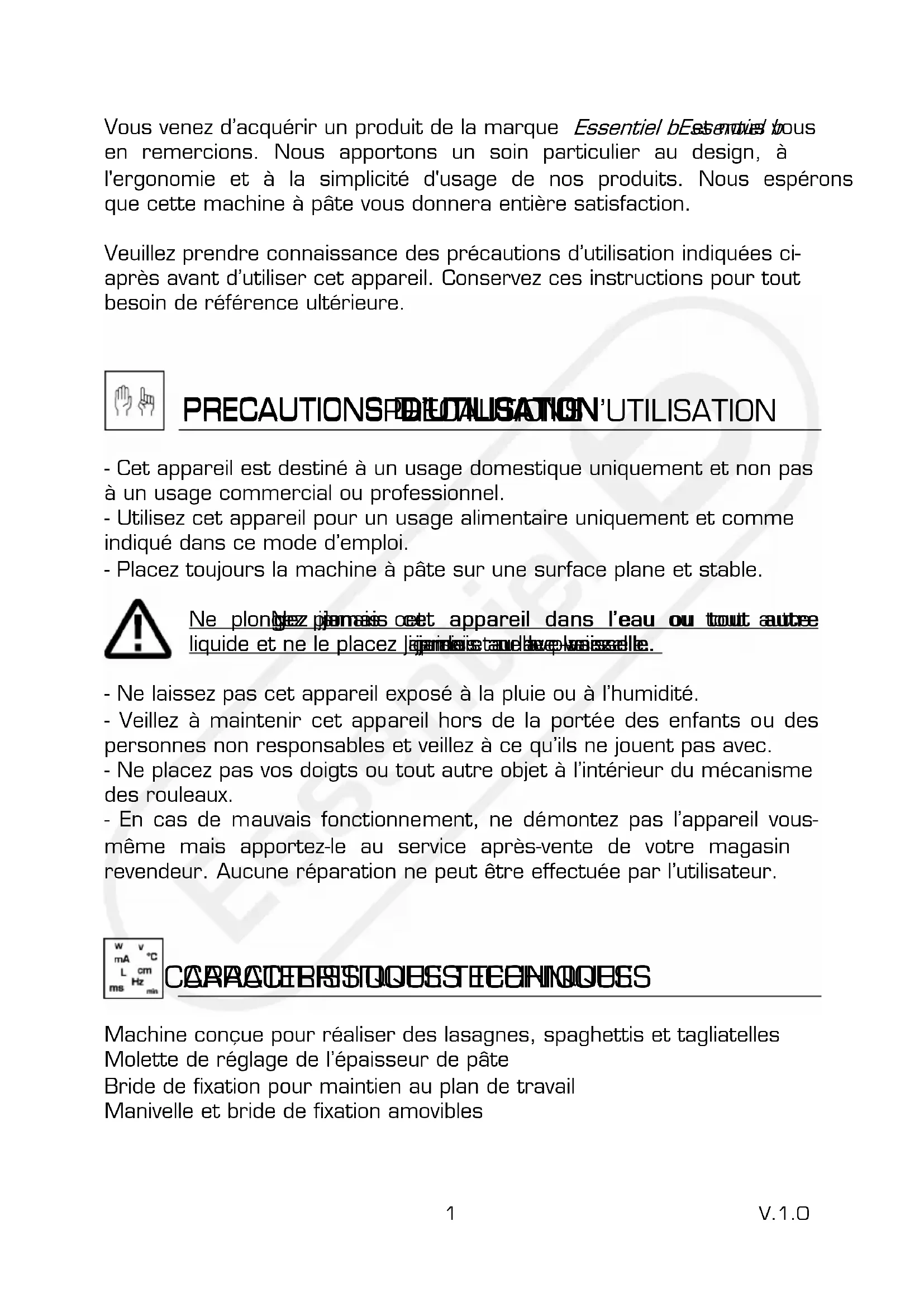 1 V.1.0 Vous venez d’acquérir un produit de la marque Essentiel b Essentiel bEssentiel b Essentiel b et nous vous en remercions. Nous apportons un soin particulier au design, à l'ergonomie et à la simplicité d'usage de nos produits. Nous espérons que cette machine à pâte vous donnera entière satisfaction. Veuillez prendre connaissance des précautions d’utilisation indiquées ci- après avant d’utiliser cet appareil. Conservez ces instructions pour tout besoin de référence ultérieure.