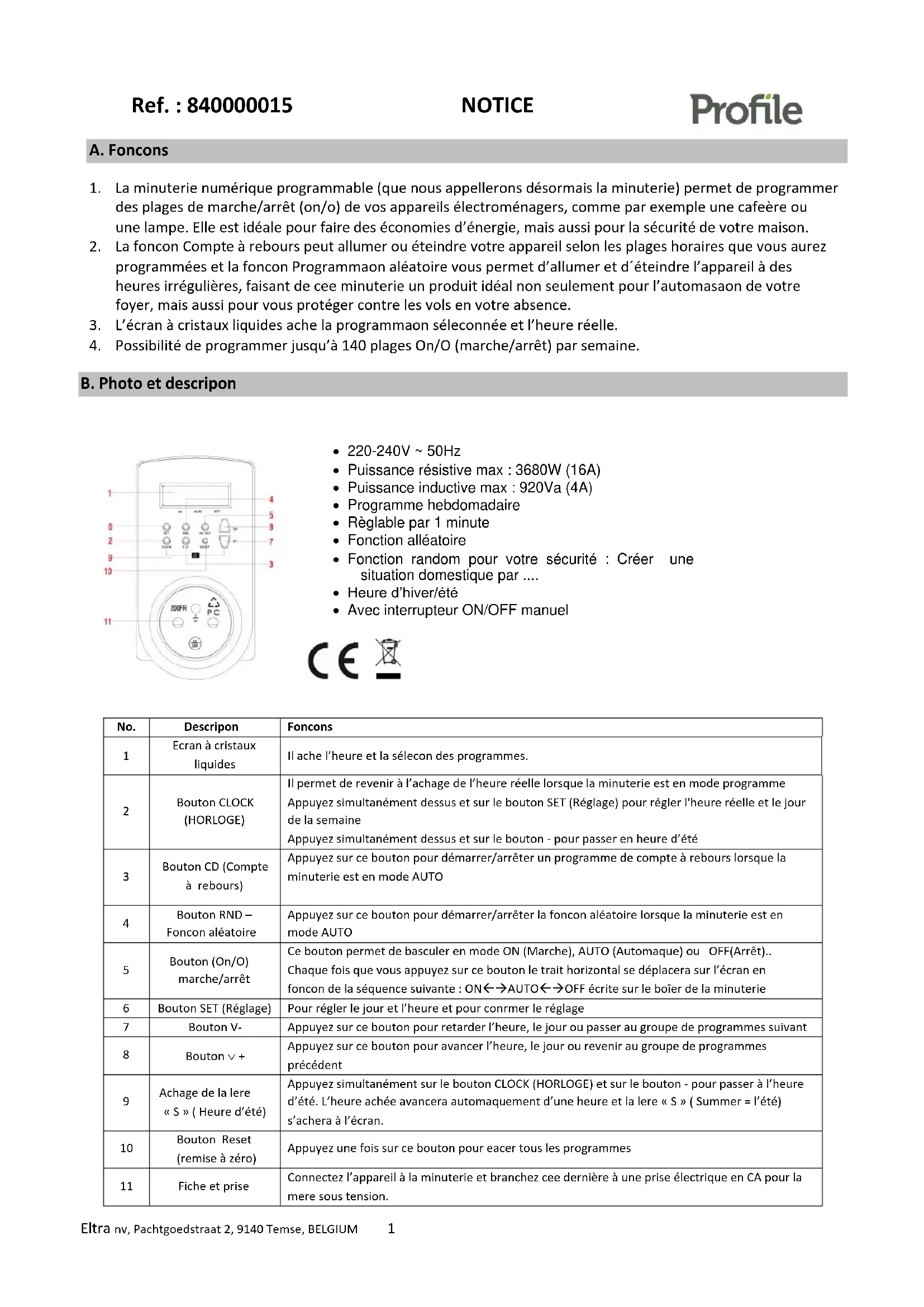 Fiche et prise Connectez l’appareil à la minuterie et branchez cette dernière à une prise électrique en CA pour la mettre sous tension. 220-240V ~ 50Hz Puissance résistive max : 3680W (16A) Puissance inductive max : 920Va (4A) Programme hebdomadaire Règlable par 1 minute Fonction alléatoire Fonction random pour votre sécurité : Créer une situation domestique par .... Heure d’hiver/été Avec interrupteur ON/OFF manuelRef. : 840000015 NOTICE Eltra nv, Pachtgoedstraat 2, 9140 Temse, BELGIUM 2 C. Affichage de l’heure Deux types d’affichage-vous sont proposés :