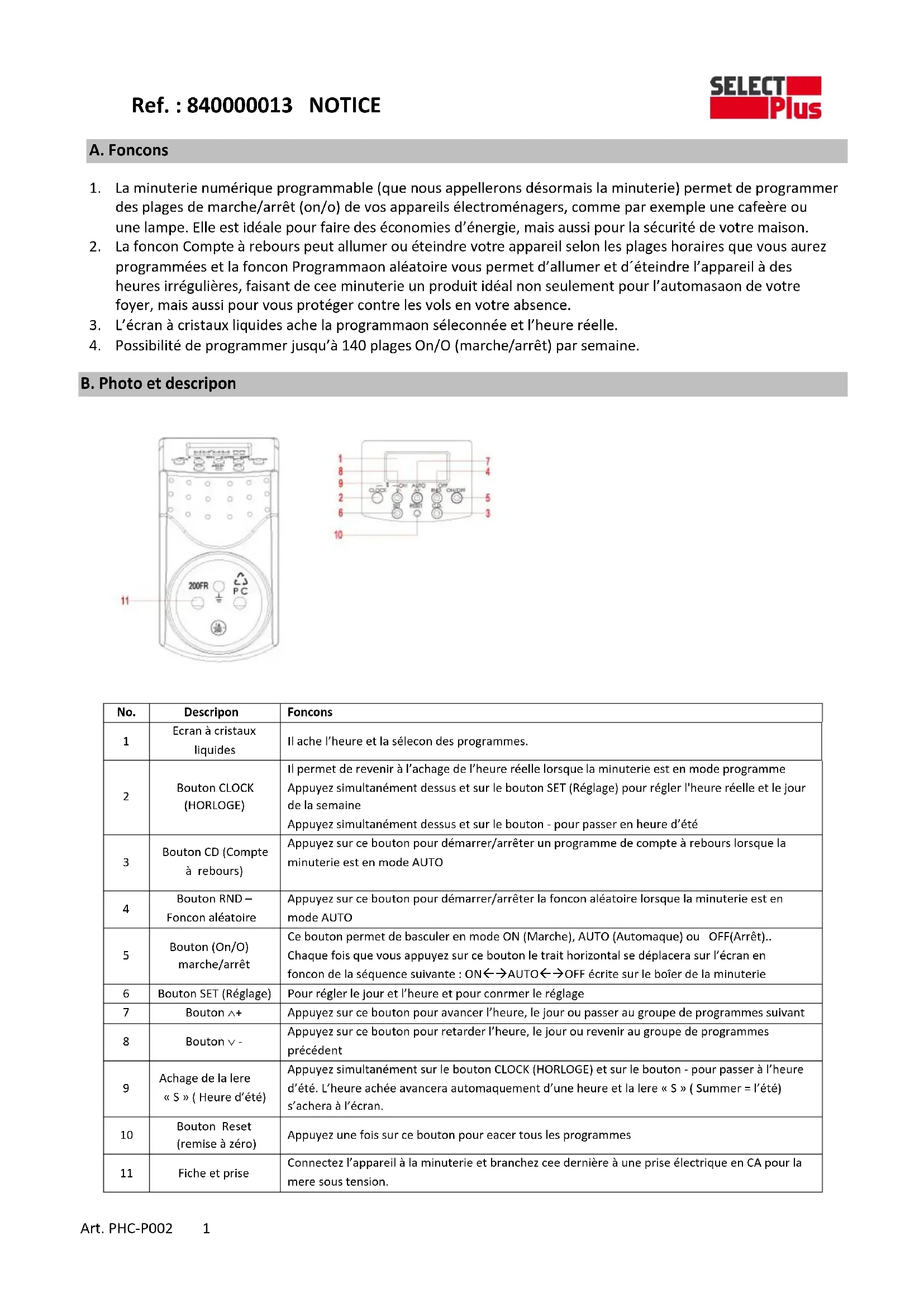 l’interruption manuelle.Ref. : 840000013 NOTICE Art. PHC-P002 6 J. Consignes de sécurité Cette minuterie est destinée à un usage en intérieur uniquement. NE L’UTILISEZ PAS en extérieur.