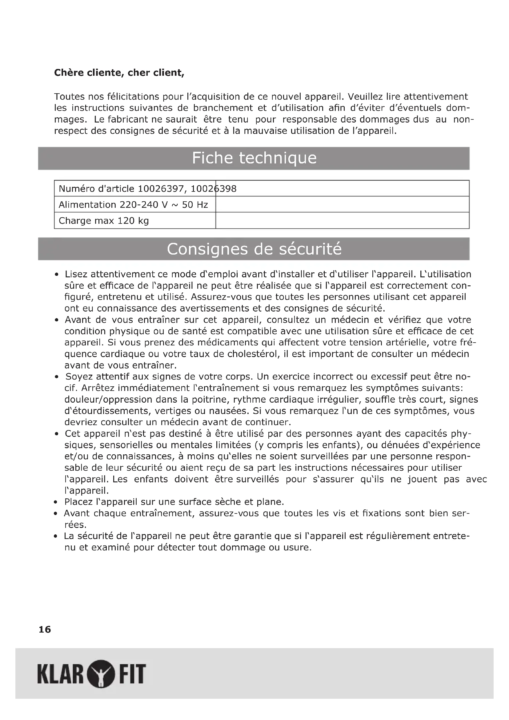 - L‘appareil a été testé et certié EN957 et est approuvé pour un usage domestique. Le poids maximal de l‘utilisateur ne doit pas dépasser 120 kg.
