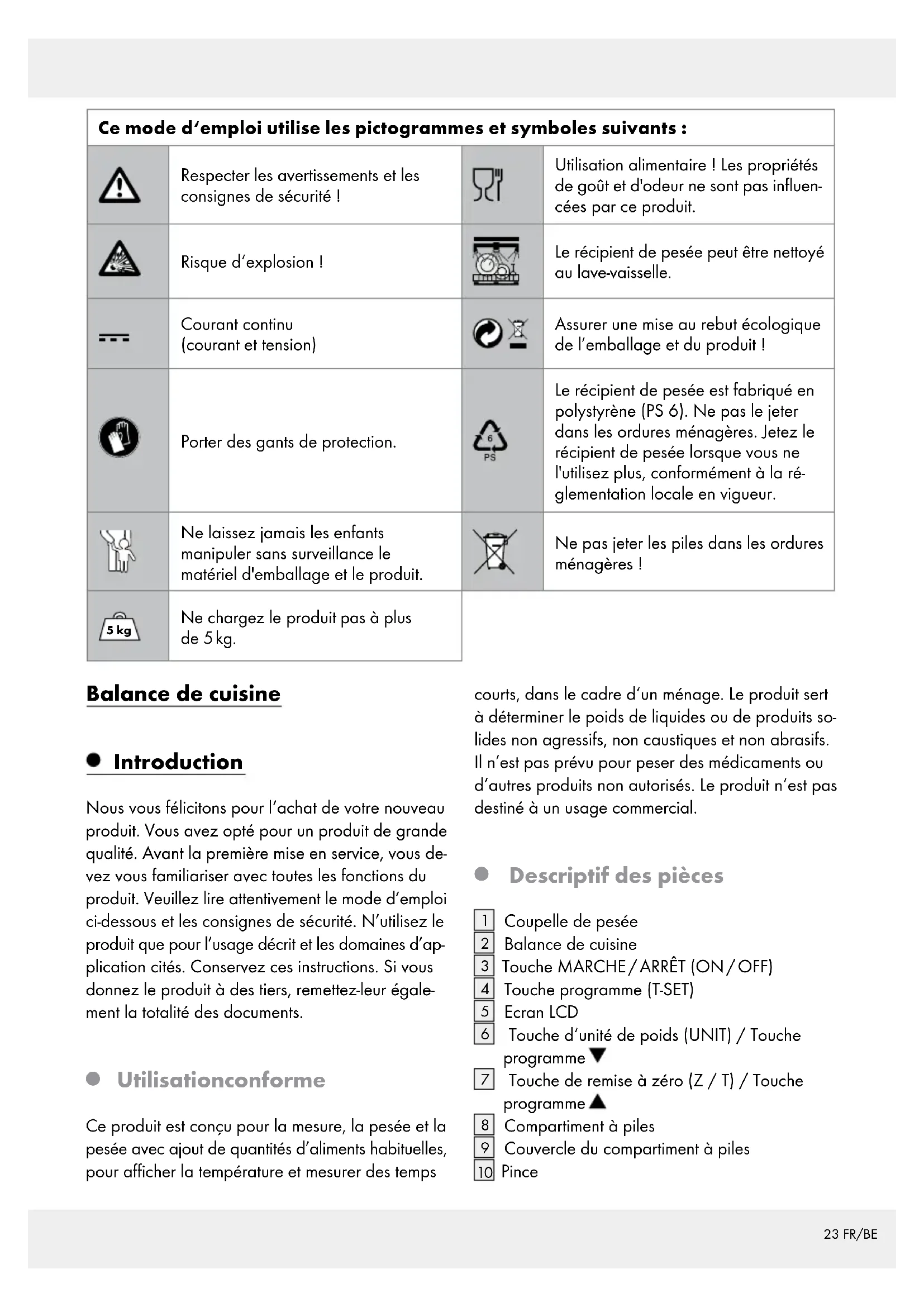 s‘ils sont surveillés ou s‘ils ont été informés de l‘utilisation sûre du produit et comprennent les risques liés à son utilisation. Les enfants ne doivent pas jouer avec le pro- duit. Le nettoyage et l‘entretien du produit ne doivent pas être effectués par des enfants laissés sans surveillance. 5 kg ATTENTION ! RISQUE DE BLESSURE ! Ne chargez le produit pas à plus de 5 kg. Le produit pourrait être en- dommagé. Ne pas exposer le produit - à des températures extrêmes, - à des vibrations trop fortes, - des effets mécaniques extrêmes, - aux rayons directs du soleil, - à un environnement magnétique, - à l‘humidité.25 FR/BE Dans le cas contraire, le produit risque d‘être endommagé. Protégez le produit contre les chargements / déchargements électrostatiques. Ceux-ci pour- raient causer un empêchement de l‘échange de données internes, ce qui provoque des erreurs sur l‘écran LCD. Avant la mise en service, contrô- ler si le produit présente des dommages. Ne pas mettre le produit endommagé en service. N‘ou- vrez jamais le couvercle du pro- duit. Ceci risque d‘engendrer des blessures et des dommages ma- tériels. Les travaux de réparations doivent être effectués par un élec- tricien certifié. Ne laissez pas des personnes inexpérimentées utiliser le produit. Veuillez vous assurer que tout utili- sateur de ce produit ait lu le mode d‘emploi et soit en mesure d‘utili- ser le produit en toute sécurité. Poser le produit sur un support fixe, horizontal et plan. Les fonctions du produit peuvent être perturbées par des champs magnétiques. Retirez pour un court moment la pile et remettez-la dans son compartiment, si le produit présente une telle perturbation. Veuillez pour cela suivre les instructions du chapitre «remplacer les piles». UTILISATION ALI- MENTAIRE ! Le produit est apte au contact alimentaire et n’altère pas les propriétés de goût ou d’odeur des denrées. Le récipient de pesée peut être nettoyé au lave-vaisselle. Indications de sécurité des piles