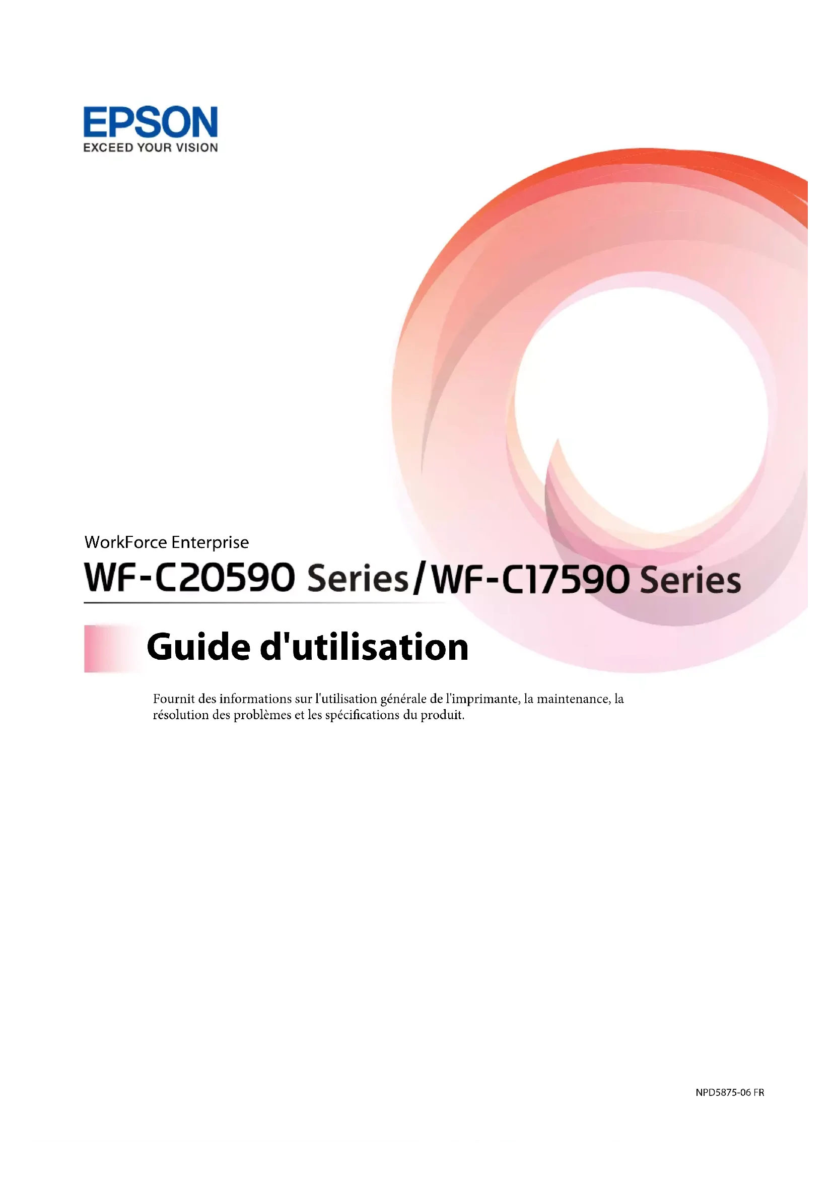 - WorkForce Enterprise Guide d'utilisation Fournit des informations sur l'utilisation générale de l'imprimante, la maintenance, la résolution des problèmes et les spécications du produit. NPD5875-06 FRTable des matières À propos des manuels Présentation des manuels p. 7
