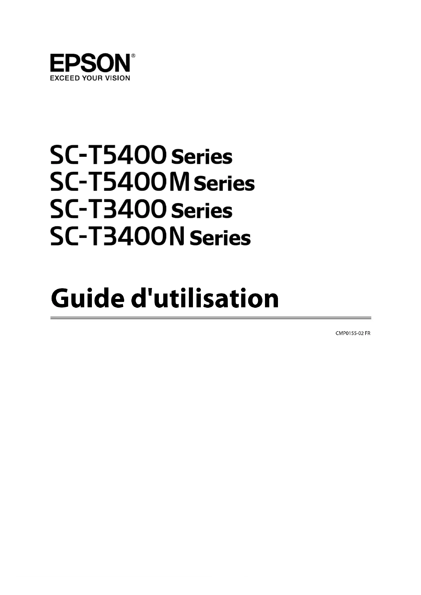 - are registered trademarks of Hewlett-Packard Corporation. The SuperSpeed USB Trident Logo is a registered trademark of USB Implementers Forum, Inc. Remarque générale : les autres noms de produits utilisés dans le présent document sont donnés uniquement à titre indicatif et peuvent constituer des marques commerciales de leurs détenteurs respectifs. Epson dénie toute responsabilité vis-à-vis de ces marques. © 2018 Seiko Epson Corporation. All rights reserved. SC-T5400 Series/SC-T5400M Series/SC-T3400 Series/SC-T3400N Series Guide d'utilisation Droits d’auteur et marques déposées 2Table des matières Droits d’auteur et marques déposées Introduction Remarques sur les manuels p. 6