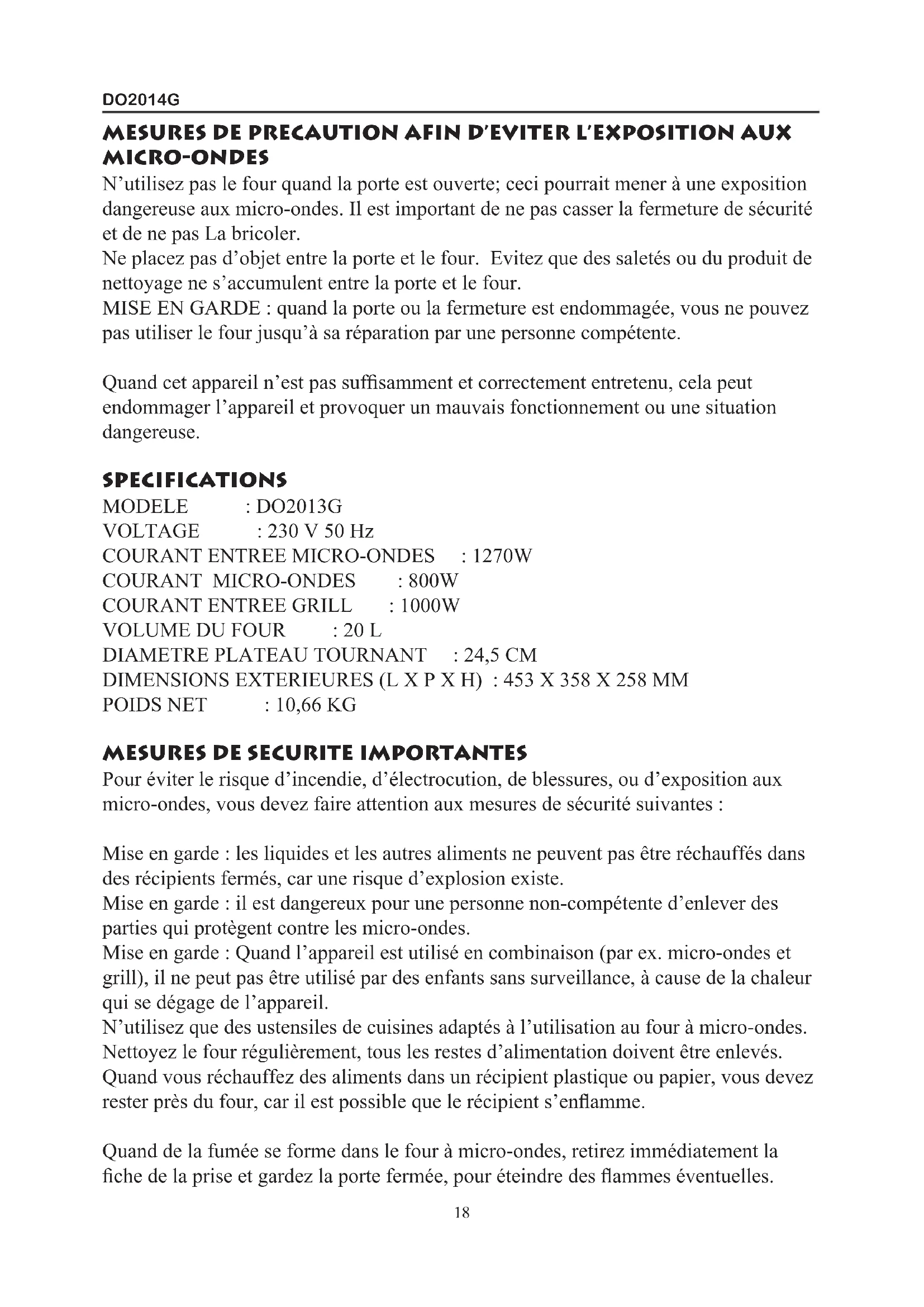 Pour éviter le risque d’incendie, d’électrocution, de blessures, ou d’exposition aux micro-ondes, vous devez faire attention aux mesures de sécurité suivantes : Mise en garde : les liquides et les autres aliments ne peuvent pas être réchauffés dans des récipients fermés, car une risque d’explosion existe. Mise en garde : il est dangereux pour une personne non-compétente d’enlever des parties qui protègent contre les micro-ondes. Mise en garde : Quand l’appareil est utilisé en combinaison (par ex. micro-ondes et grill), il ne peut pas être utilisé par des enfants sans surveillance, à cause de la chaleur qui se dégage de l’appareil. N’utilisez que des ustensiles de cuisines adaptés à l’utilisation au four à micro-ondes. Nettoyez le four régulièrement, tous les restes d’alimentation doivent être enlevés. Quand vous réchauffez des aliments dans un récipient plastique ou papier, vous devez rester près du four, car il est possible que le récipient s’enamme. Quand de la fumée se forme dans le four à micro-ondes, retirez immédiatement la che de la prise et gardez la porte fermée, pour éteindre des ammes éventuelles. 18DO2014G Ne laissez pas trop cuire les aliments. N’utilisez pas le four pour stocker des objets. Ne gardez pas de pain, de gateaux, etc. dans le four. Enlevez l’attache et les poignées en métal de l’emballage avant de le placer dans le four. N’installez le four que selon les instructions d’installation. Les œufs dans leur coquilles ou les œufs durs entier ne peuvent pas être chauffés dans le four à micro-ondes. Ils pourraient exploser, même une fois que le four est éteint. N’utilisez cet appareil que conformément à la description de ce mode d’emploi. N’utilisez pas de produits chimiques ou des vapeurs dans cet appareil. Ce four est uniquement destiné à réchauffer. L’appareil n’est pas adapté à un usage industriel ou en laboratoire. Quand le cordon électrique est endommagé, il doit être remplacé par le fabricant, son service après-vente ou par une personne compétente, an d’éviter des accidents ou des dommages. N’utilisez ou ne conservez pas l’appareil à l’extérieur. N’utilisez pas le four à proximité d’eau, dans un espace humide ou à proximité d’une piscine. Le four peut chauffer pendant l’utilisation. Tenez le cordon électrique à distance de parties chaudes et ne couvrez pas le four. Ne laissez jamais le cordon pendre au bord d’une table ou d’un comptoir. Si vous ne nettoyez pas bien le four, cela peut entraîner des dégâts pour l’appareil et éventuellement des situations dangereuses. Le contenu de biberons et d’alimentation pour bébés doit toujours être secoué ou remué. La température doit être contrôlée avant d’utiliser les aliments, an d’éviter les brûlures. Le chauffage de liquides dans le four peut causer une réaction d’ébullition retardée du liquide. Soyez donc toujours prudent en enlevant le récipient du four. Cet appareil ne peut pas être utilisé par des personnes (y compris les enfants) ayant des capacités physiques, sensorielles ou mentales diminuées, ou par les personnes qui manquent d’expérience. Sauf si ces personnes utilisent l’appareil sous surveillance ou ont reçu sufsamment d’informations concernant l’utilisation correcte de l’appareil de la part d’une personne responsable de leur sécurité. Veillez à ce que les enfants ne puissent pas jouer avec l’appareil. Cet appareil ne peut pas être placé dans un placard. Cet appareil ne peut pas être utilisé avec un minuteur externe ou une commande à distance séparée. N’utilisez pas de nettoyeur vapeur pour nettoyer votre appareil. N’utilisez pas des produits de nettoyage corrosifs ou des objets pointus pour nettoyer la vitre de la porte. Ceci pourrait endommager la vitre et pourrait amener à ce que la vitre se fende. La porte de l’appareil peut devenir chaude pendant l’utilisation. Cet appareil est destiné à être utilisé dans des applications domestiques et analogues 19DO2014G telles que: – des coins cuisines réservés au personnel dans des magasins, bureaux et autres environnements professionnels; – des fermes; – l’utilisation par les clients des hôtels, motels et autres environnements à caractère résidentiel; – des environnements du type chambres d’hôtes.