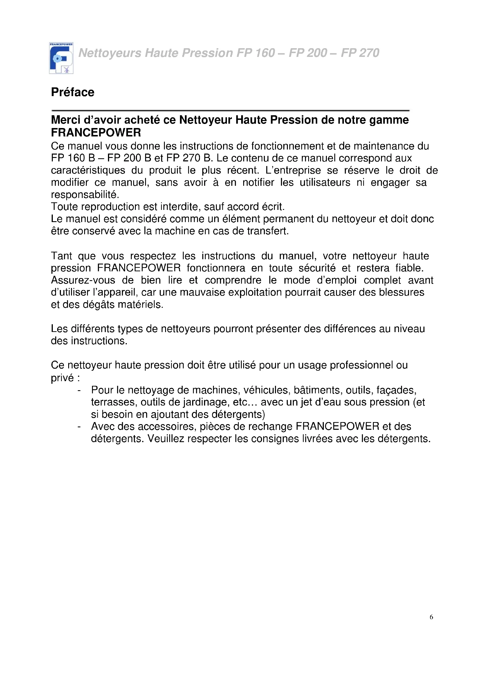 Préface Merci d’avoir acheté ce Nettoyeur Haute Pression de notre gamme FRANCEPOWER Ce manuel vous donne les instructions de fonctionnement et de maintenance du FP 160 B – FP 200 B et FP 270 B. Le contenu de ce manuel correspond aux caractéristiques du produit le plus récent. L’entreprise se réserve le droit de modifier ce manuel, sans avoir à en notifier les utilisateurs ni engager sa responsabilité. Toute reproduction est interdite, sauf accord écrit. Le manuel est considéré comme un élément permanent du nettoyeur et doit donc être conservé avec la machine en cas de transfert. Tant que vous respectez les instructions du manuel, votre nettoyeur haute pression FRANCEPOWER fonctionnera en toute sécurité et restera fiable. Assurez-vous de bien lire et comprendre le mode d’emploi complet avant d’utiliser l’appareil, car une mauvaise exploitation pourrait causer des blessures et des dégâts matériels. Les différents types de nettoyeurs pourront présenter des différences au niveau des instructions. Ce nettoyeur haute pression doit être utilisé pour un usage professionnel ou privé : - Pour le nettoyage de machines, véhicules, bâtiments, outils, façades, terrasses, outils de jardinage, etc… avec un jet d’eau sous pression (et si besoin en ajoutant des détergents) - Avec des accessoires, pièces de rechange FRANCEPOWER et des détergents. Veuillez respecter les consignes livrées avec les détergents.Nettoyeurs Haute Pression FP 160 – FP 200 – FP 270