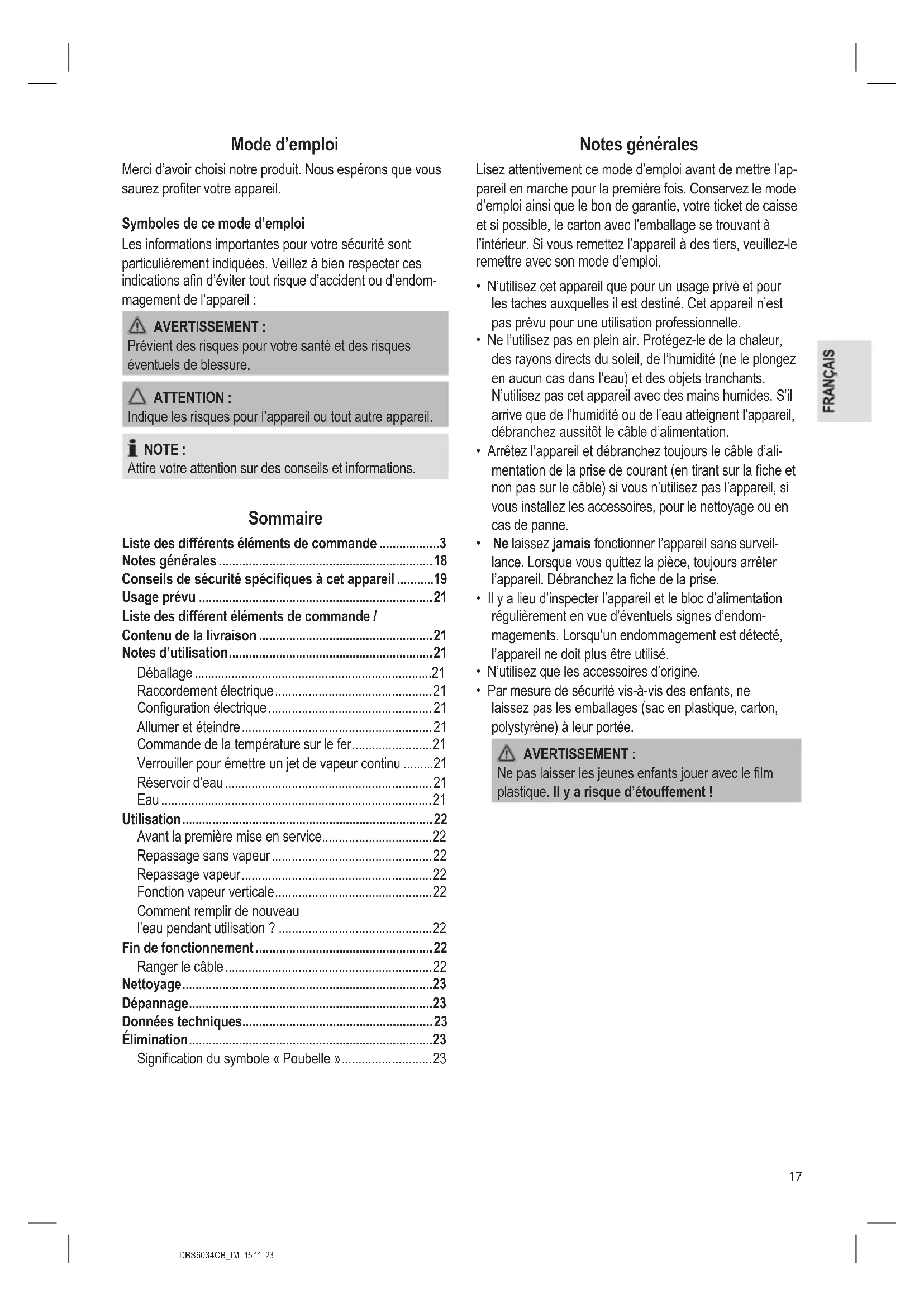 - L’eau non utilisée peut rester dans l’appareil. Il est néanmoins conseillé de la jeter lorsqu’elle est depuis longtemps dans l’appareil. Dépannage Problème Cause possible Solution Appareil sans fonction. Prise du secteur défectueuse. Essayez une autre prise. Pendant le service, l’appareil est subitement sans fonction. Est-ce que le circuit du secteur est surchargé ? Contrôlez le fusible chez vous. Absence de vapeur. Le réservoir d’eau n’est pas bien installé. Poussez le réservoir d’eau fermement dans la base. Il doit s’emboîter en émettant un bruit. La température réglée est trop basse. Sélectionnez une température entre et . Bruit important pendant le service vapeur. Le réservoir est vide. Contrôlez le réservoir. Remplissez le réservoir d’eau. Démarrage initial ou après une longue durée sans utilisation. Ces bruits de pompe sont normaux. Données techniques Modèle : ...........................................................DBS 6034 CB Alimentation : .....................................220 - 240 V~, 50 - 60 Hz Consommation : ............................................... 2200 - 2400 W Classe de protection : ............................................................ Volume maximum de remplissage du réservoir d’eau: ......................................................1,2 litre Poids net : ..............................................................env. 2,3 kg Nous nous réservons le droit d’apporter des modications techniques ainsi que des modications de conception dans le cadre du développement continu de nos produits. Cet appareil est conforme à toutes les directives CE en vigueur, telles que les directives sur la compatibilité électro- magnétique et les faibles tensions et a été fabriqué selon les derniers règlements de sécurité. Élimination Signification du symbole « Poubelle » Protégez votre environnement, ne jetez pas vos appareils électriques avec les ordures ména- gères. Utilisez, pour l’élimination de vos appareils électriques, les bornes de collecte prévues à cet effet où vous pouvez vous débarrasser des appareils que vous n’utilisez plus. Vous contribuez ainsi à éviter les impacts potentiels dans l’environnement et sur la santé de chacun, causés par une mauvaise élimination de ces déchets. Vous contribuez aussi au recyclage sous toutes ses formes des appareils électriques et électroniques usagés. Vous trouverez toutes les informations sur les bornes d’élimination des appareils auprès de votre commune ou de l’administration de votre communauté. Votre revendeurDBS6034CB_IM 15.11. 23