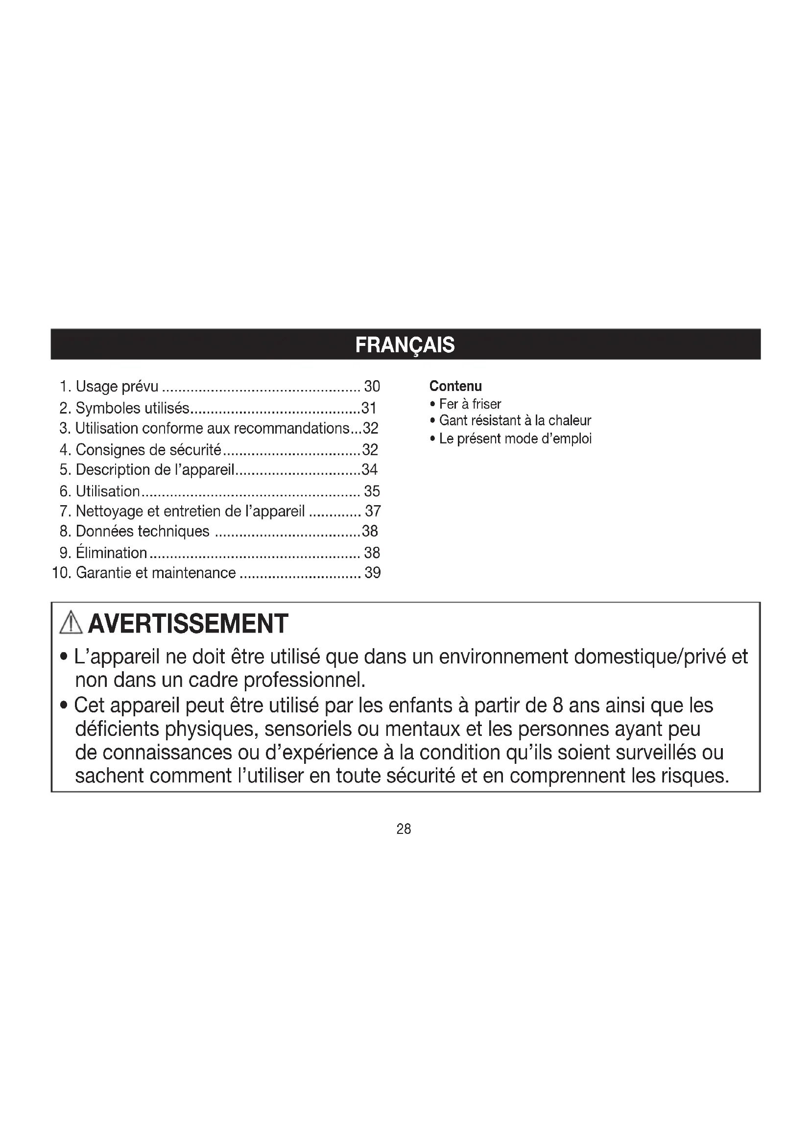 Le fer à friser est exclusivement destiné pour le bouclage et l’ondulation des cheveux humains, dans le cadre d’un usage privé. Avertissement N’utilisez l’appareil que de la façon suivante: