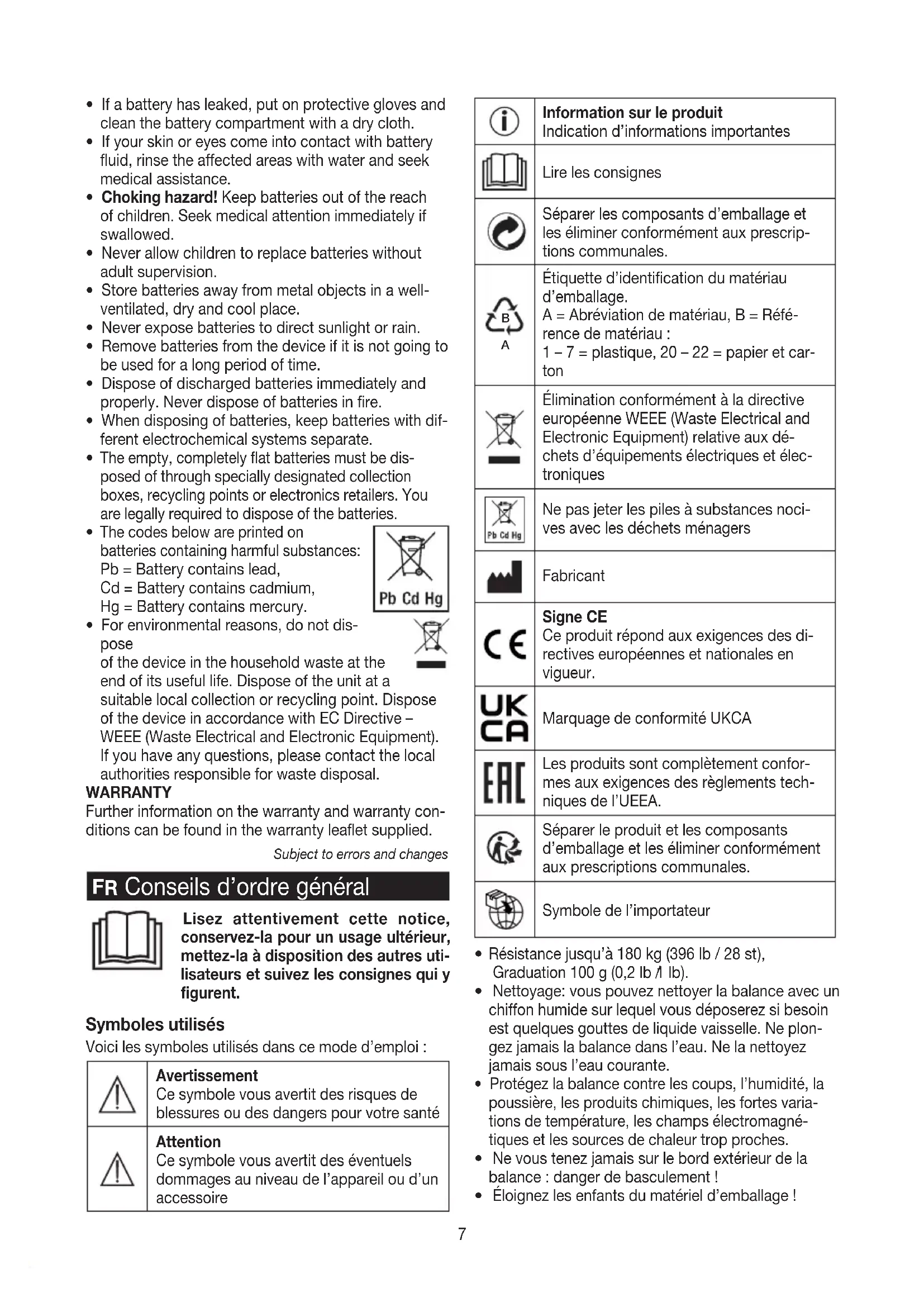 | Informations générales | Garantie de 3 ans, poids de la balance : 1,5 kg, fonctionne avec des piles AAA |