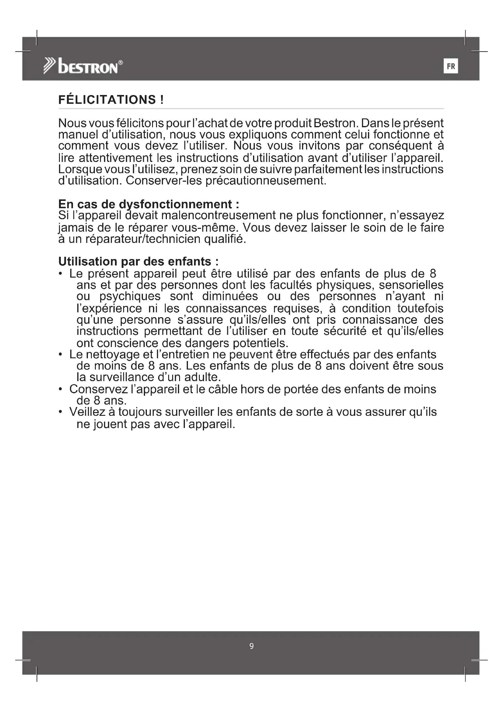 DEFÉLICITATIONS ! Nous vous félicitons pour l’achat de votre produit Bestron. Dans le présent manuel d’utilisation, nous vous expliquons comment celui fonctionne et comment vous devez l’utiliser. Nous vous invitons par conséquent à lire attentivement les instructions d’utilisation avant d’utiliser l’appareil. Lorsque vous l’utilisez, prenez soin de suivre parfaitement les instructions d’utilisation. Conserver-les précautionneusement. En cas de dysfonctionnement : Si l’appareil devait malencontreusement ne plus fonctionner, n’essayez jamais de le réparer vous-même. Vous devez laisser le soin de le faire à un réparateur/technicien qualifié. Utilisation par des enfants :