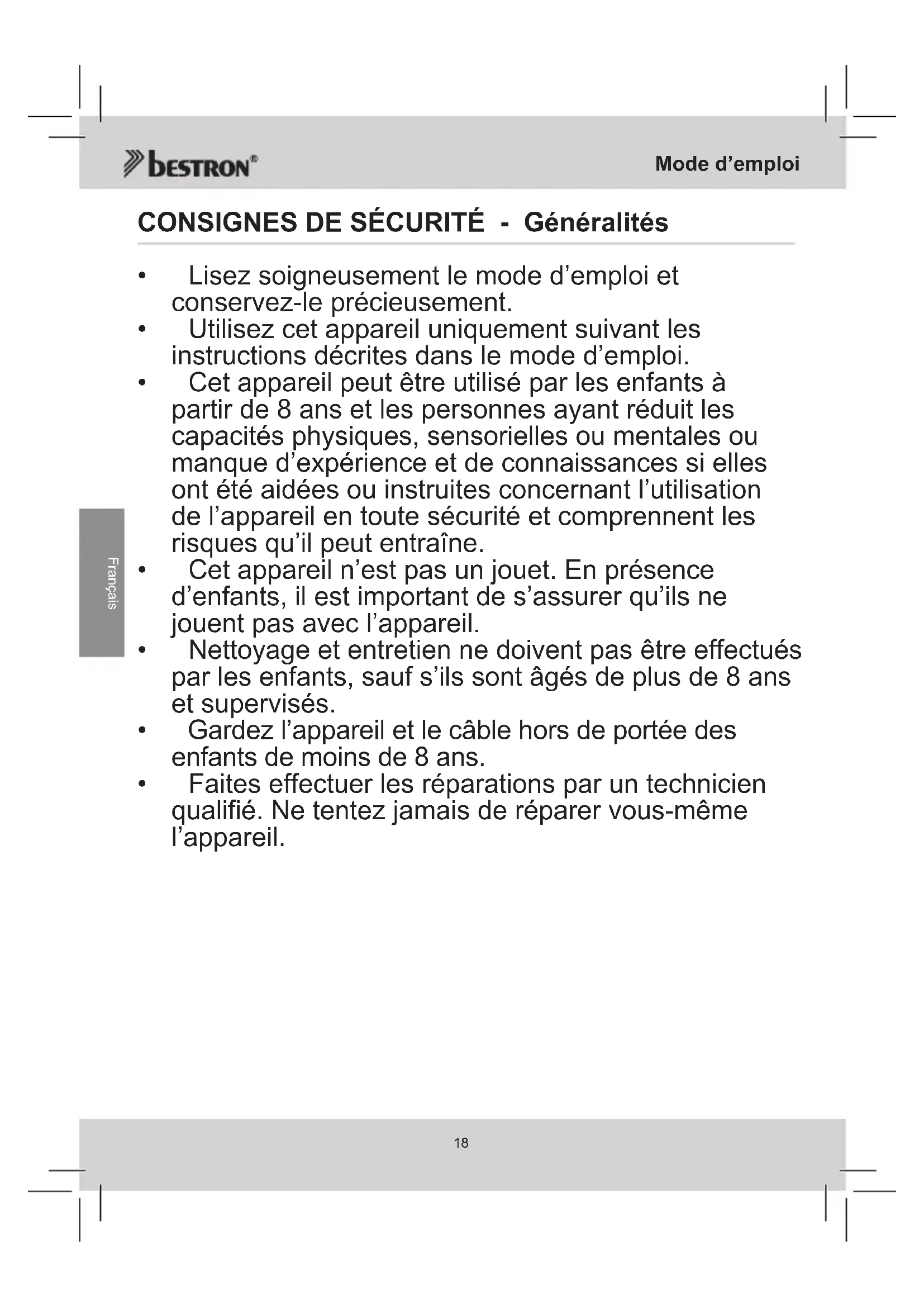 - Faiteseffectuerlesréparationsparuntechnicien qualifié.Netentezjamaisderéparervous-même l’appareil.Mode d’emploi