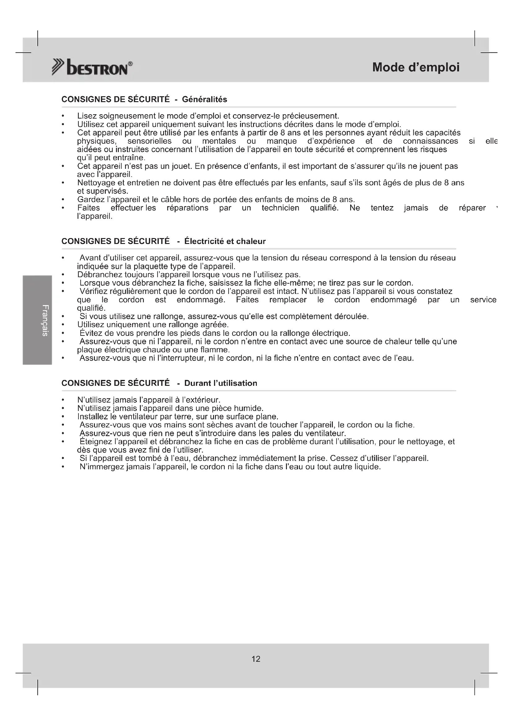 Français CONSIGNES DE SÉCURITÉ - Généralités
