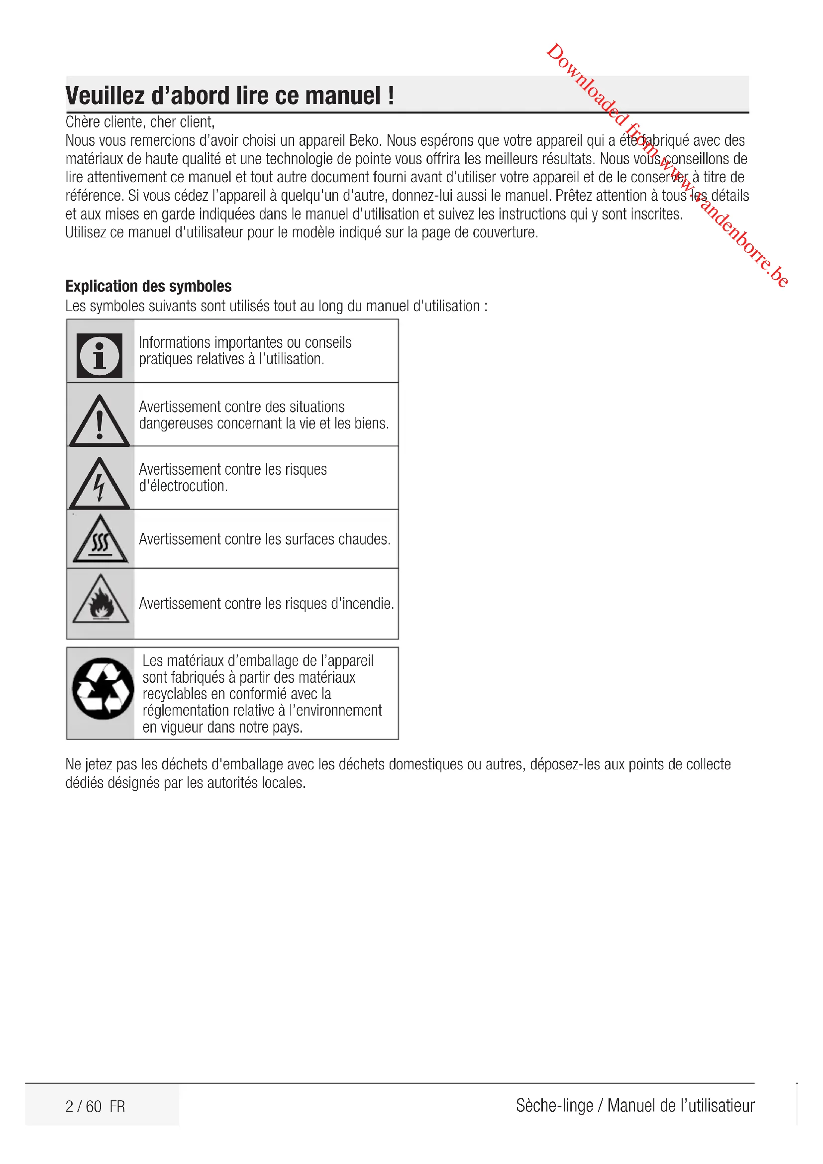 Informations importantes ou conseils pratiques relatives à l’utilisation. Avertissement contre des situations dangereuses concernant la vie et les biens. Avertissement contre les risques d'électrocution.Avertissement contre les surfaces chaudes.Avertissement contre les risques d'incendie.Les matériaux d’emballage de l’appareil sont fabriqués à partir des matériaux recyclables en conformié avec la réglementation relative à l’environnement en vigueur dans notre pays. Ne jetez pas les déchets d'emballage avec les déchets domestiques ou autres, déposez-les aux points de collecte dédiés désignés par les autorités locales. Downloaded from www.vandenborre.be3 / 60 FR Sèche-linge / Manuel de l’utilisatieur 1 Consignes importantes en matière de sécurité et d'environnement Cette section comprend des consignes de sécurité qui aideront à vous protéger contre les blessures corporelles ou à éviter des dégâts matériels. Le non respect de ces consignes annulera toute garantie.