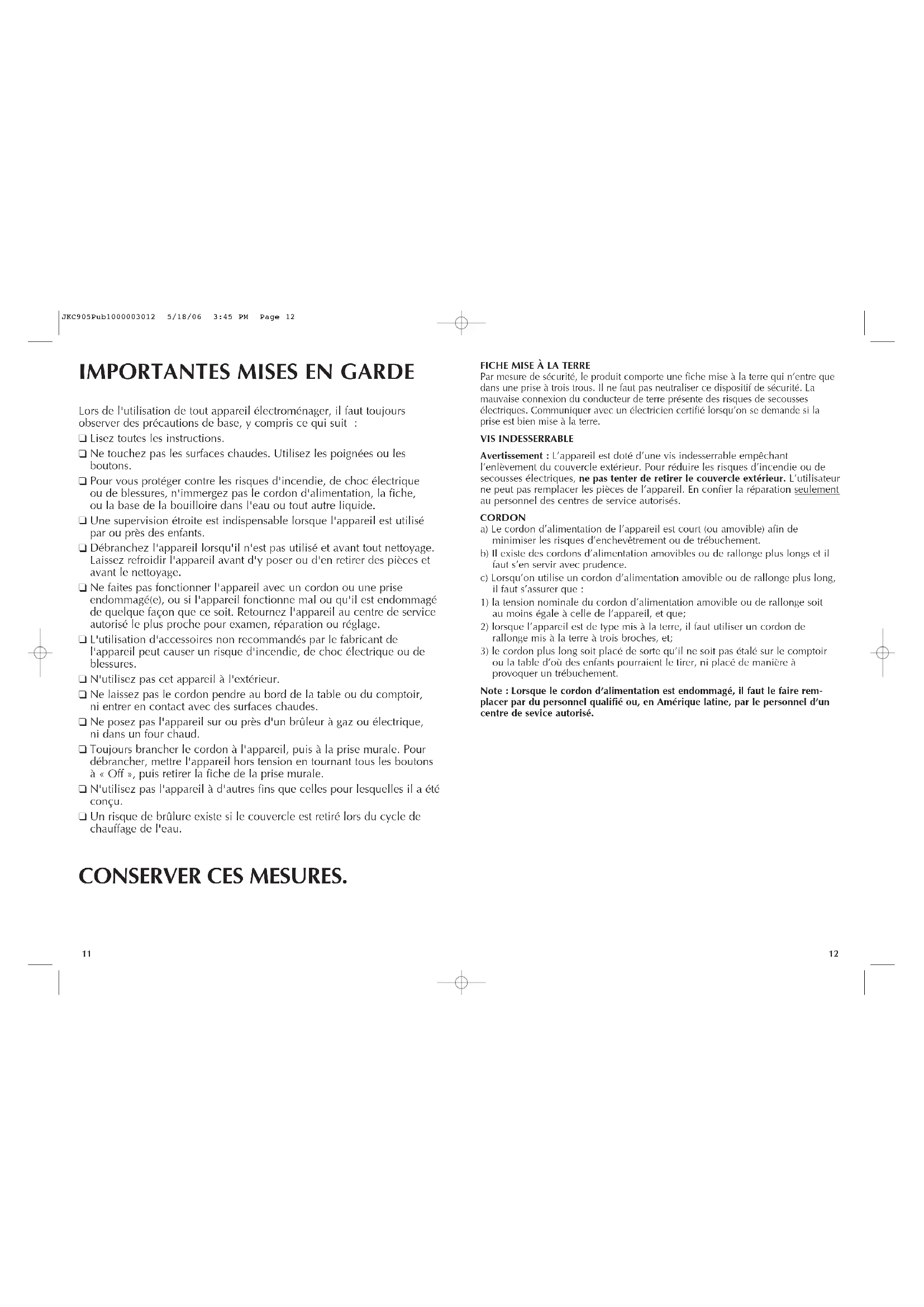 Un risque de brûlure existe si le couvercle est retiré lors du cycle de chauffage de l'eau. CONSERVER CES MESURES.