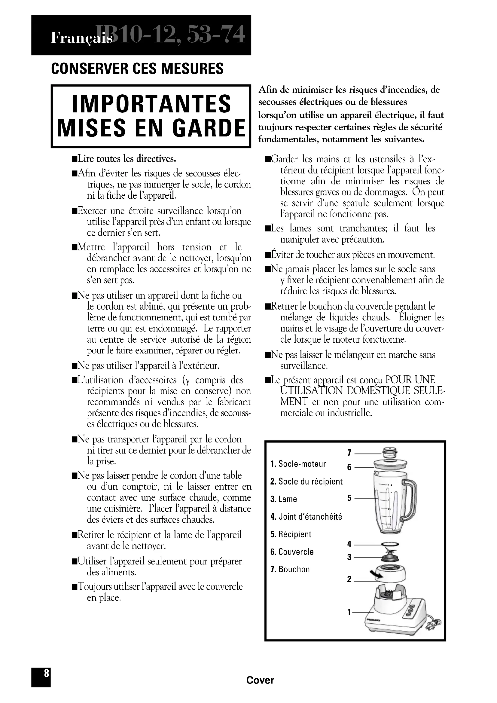 Afin de minimiser les risques d’incendies, de secousses électriques ou de blessures lorsqu’on utilise un appareil électrique, il faut toujours respecter certaines règles de sécurité fondamentales, notamment les suivantes. ■ Lire toutes les directives.■ Afin d’éviter les risques de secousses élec- triques, ne pas immerger le socle, le cordon ni la fiche de l’appareil. ■ Exercer une étroite surveillance lorsqu’on utilise l’appareil près d’un enfant ou lorsque ce dernier s’en sert. ■ Mettre l’appareil hors tension et le débrancher avant de le nettoyer, lorsqu’on en remplace les accessoires et lorsqu’on ne s’en sert pas. ■ Ne pas utiliser un appareil dont la fiche ou le cordon est abîmé, qui présente un prob- lème de fonctionnement, qui est tombé par terre ou qui est endommagé. Le rapporter au centre de service autorisé de la région pour le faire examiner, réparer ou régler. ■ Ne pas utiliser l’appareil à l’extérieur.■ L’utilisation d’accessoires (y compris des récipients pour la mise en conserve) non recommandés ni vendus par le fabricant présente des risques d’incendies, de secouss- es électriques ou de blessures. ■ Ne pas transporter l’appareil par le cordon ni tirer sur ce dernier pour le débrancher de la prise. ■ Ne pas laisser pendre le cordon d’une table ou d’un comptoir, ni le laisser entrer en contact avec une surface chaude, comme une cuisinière. Placer l’appareil à distance des éviers et des surfaces chaudes. ■ Retirer le récipient et la lame de l’appareil avant de le nettoyer. ■ Utiliser l’appareil seulement pour préparer des aliments. ■ Toujours utiliser l’appareil avec le couvercle en place. ■ Garder les mains et les ustensiles à l’ex- térieur du récipient lorsque l’appareil fonc- tionne afin de minimiser les risques de blessures graves ou de dommages. On peut se servir d’une spatule seulement lorsque l’appareil ne fonctionne pas. ■ Les lames sont tranchantes; il faut les manipuler avec précaution. ■ Éviter de toucher aux pièces en mouvement.■ Ne jamais placer les lames sur le socle sans y fixer le récipient convenablement afin de réduire les risques de blessures. ■ Retirer le bouchon du couvercle pendant le mélange de liquides chauds. Éloigner les mains et le visage de l’ouverture du couver- cle lorsque le moteur fonctionne. ■ Ne pas laisser le mélangeur en marche sans surveillance. ■ Le présent appareil est conçu POUR UNE