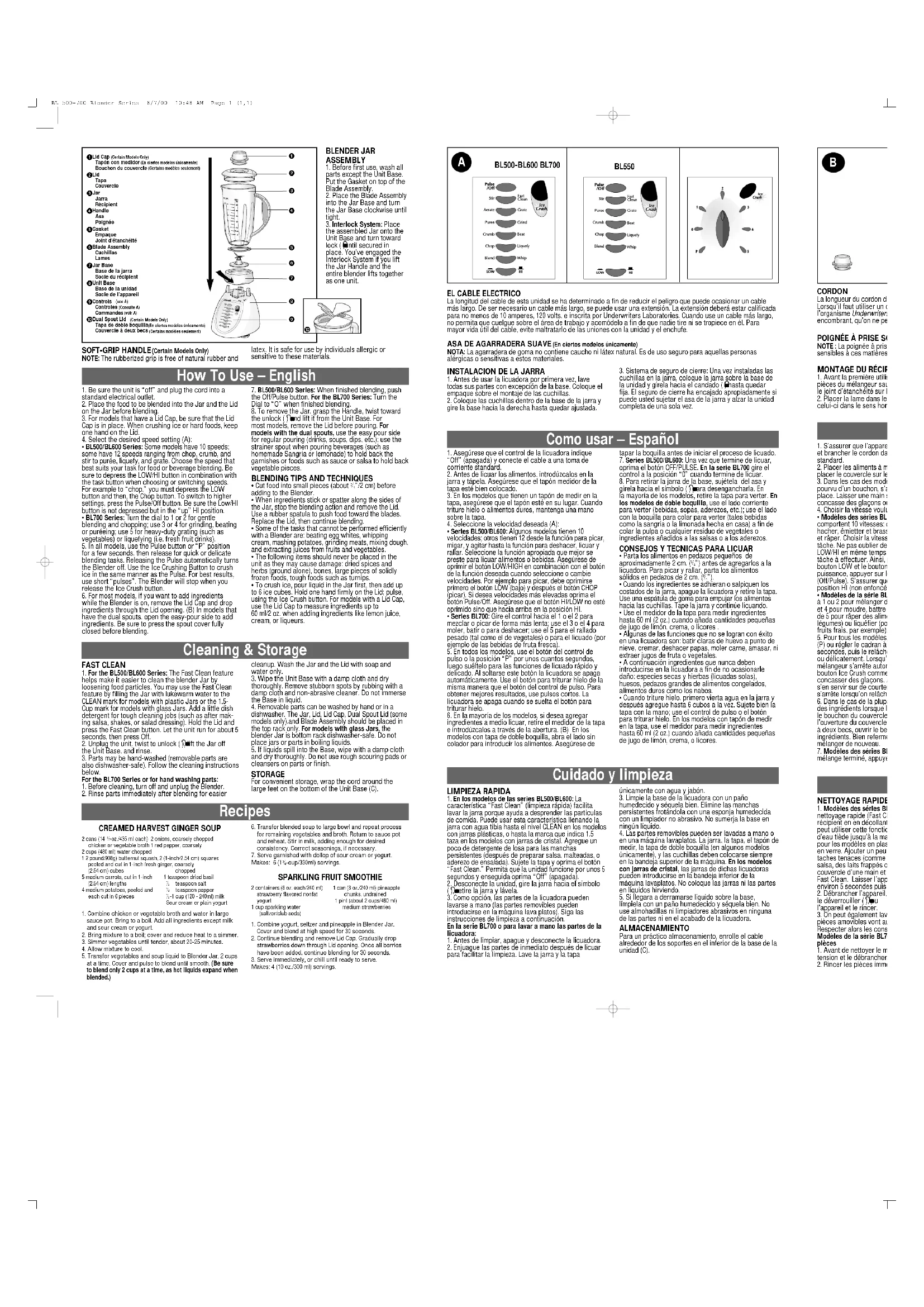 assemblé dans le socle de l’appareil et le faire tourner vers le pictogramme de verrouillage ( ) jusqu’à ce qu’il soit fixé en place. Le dispositif d’asservissement est alors engagé. Si on soulève la poignée du récipient, tout le mélangeur est soulevé. OUPLE (Certains modèles seulement) e souple ne comporte ni caoutchouc naturel ni latex. Les personnes allergiques ou s peuvent donc se servir de l’appareil. e l’appareil a été déterminée afin de réduire les risques que présente un cordon long. cordon de rallonge, choisir un cordon d’au moins 10 ampères, 120 volts, homologué par rs Laboratories. Lorsqu’on utilise un cordon de rallonge, s’assurer qu’il n’est pas eut pas tirer ni trébucher dessus. Utilisation – Français BL 500-700 Blender Series 8/7/00 10:48 AM Page 1 (2,1)hang over the edgech hot surfaceshould be placed away es. e Assembly from theod/beverageout of container whilecarefully.parts. Always operatey, never place cutterwithout the Jar, remove the Lid Cap.y from the Lid Capnning.tended during use. for household usecial or industrial use.n intended will void INSTRUCCIONES IMPORTANTES DE SEGURIDAD IMPORTANTES MISES EN GARDE ProB Blender Licuado Mélang