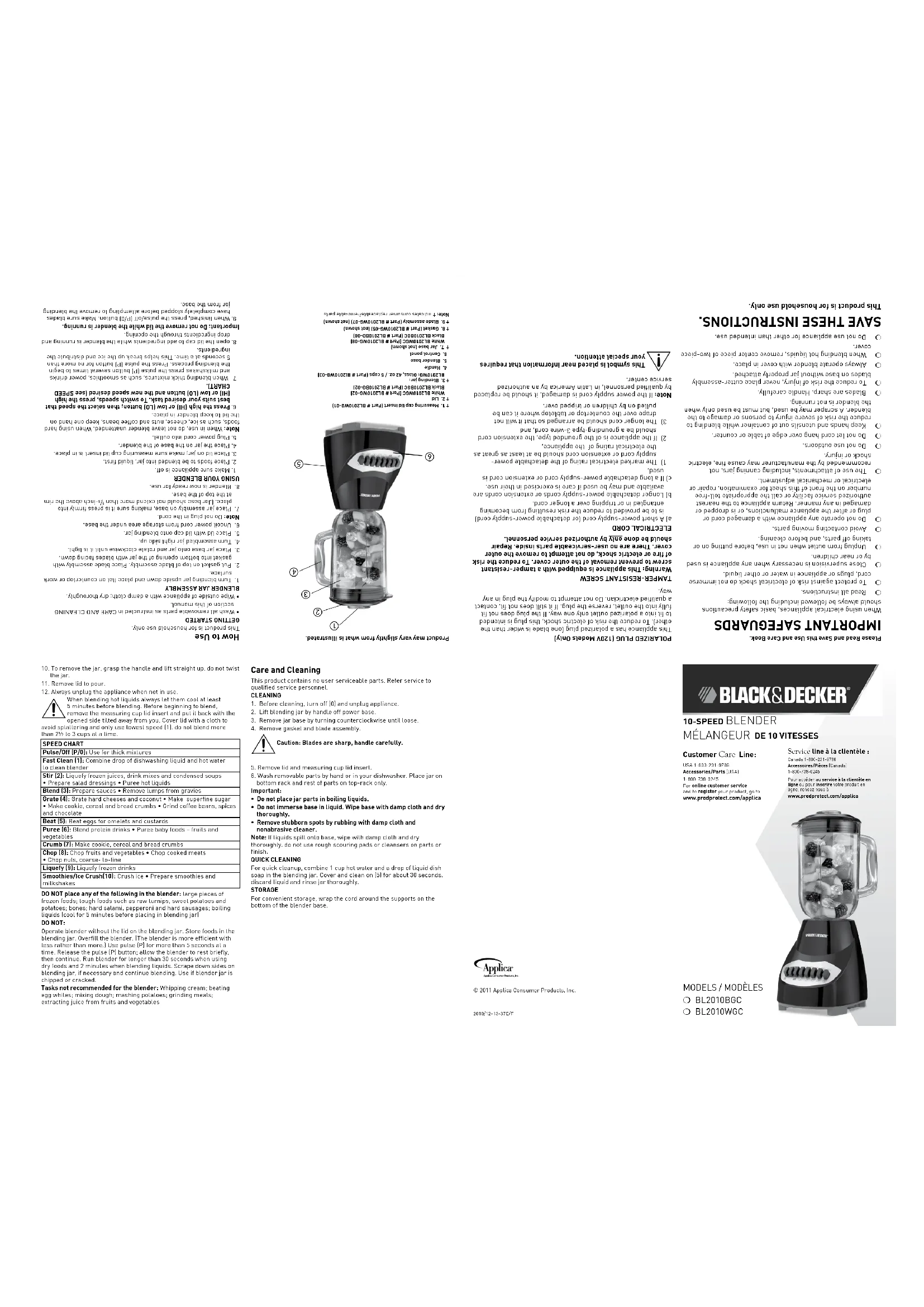 Lorsqu’on utilise des appareils électriques, il faut toujours respecter certaines règles de sécurité fondamentales, notamment les suivantes :: ❍ Lire toutes les directives. ❍ Afin d’éviter les risques de choc électrique, ne pas immerger le cordon, la fiche ou l’appareil dans l’eau ou tout autre liquide. ❍ exercer une étroite surveillance lorsque l’appareil est utilisé par un enfant ou près d’un enfant. ❍ Débrancher l’appareil lorsqu’il ne sert pas, avant d’y placer ou d’en retirer des composantes, et de le nettoyer. ❍ Éviter tout contact avec les pièces mobiles. ❍ Ne pas utiliser un appareil dont la fiche ou le cordon est abîmé, qui fonctionne mal ou qui a été endommagé de quelque façon que ce soit. Pour un examen, une réparation ou un réglage, rapporter l’appareil à un centre de service autorisé. ou composer le numéro sans frais inscrit sur la page couverture du présent guide. ❍ L’utilisation d’accessoires, y compris les bocaux à conserve, non recommandés par le fabricant peut occasionner un incendie, des chocs électriques ou des blessures. ❍ Ne pas utiliser l’appareil à l’extérieur. ❍ Ne pas laisser pendre le cordon sur le bord d’une table ou d’un comptoir. ❍ Garder mains et ustensiles hors du récipient pendant l’utilisation pour réduire les risques de blessures graves ou de dommages. Utiliser une spatule, mais seulement lorsque l’appareil est arrêté. ❍ Les lames sont tranchantes. Manipuler avec soin. ❍ Pour réduire les risques de blessures, ne jamais fixer les lames sur la base sans avoir installer correctement le bocal. ❍ Pour mélanger des liquides chauds, retirer la pièce centrale du couvercle. ❍ Pour mélanger des liquides chauds, retirer la pièce centrale du couvercle. CONSERVER CES INSTRUCTIONS. L'appareil est conçu pour une utilisation domestique seulement.FICHE POLARISÉE (Modèles de 120 V seulement)L'appareil est muni d'une fiche polarisée (une lame plus large que l'autre). Afin de minimiser les risques de secousses électriques, ce genre de fiche n'entre que d'une façon dans une prise polarisée. lorsqu'on ne peut insérer la fiche à fond dans la prise, il faut tenter de le faire après avoir inversé les lames de côté. Si la fiche n'entre toujours pas dans la prise, il faut communiquer avec un électricien certifié. Il ne faut pas tenter de modifier la fiche.CORDONa) Le cordon d’alimentation de l’appareil est court (ou amovible) afin de minimiser les risques d’enchevêtrement ou de trébuchement.b) Il existe des cordons d’alimentation amovibles ou de rallonge plus longs et il faut s’en servir avec prudence.c) Lorsqu’on utilise un cordon d’alimentation amovible ou de rallonge plus long, il faut s’assurer que :1) La tension nominale du cordon d’alimentation amovible ou de rallonge soit au moins égale à celle de l’appareil, et que;2) Lorsque l’appareil est de type mis à la terre, il faut utiliser un cordon de rallonge mis à la terre à trois broches, et;3) Le cordon plus long soit placé de sorte qu’il ne soit pas étalé sur le comptoir ou la table d’où des enfants pourraient le tirer, ni placé de manière à provoquer un trébuchement.Note : Lorsque le cordon d’alimentation est endommagé, il faut le faire remplacer par du personnel qualifié.Ce symbole signale des renseignements qui nécessitent une attention particulière.† 1. Tasse à mesurer intégrée au couvercle (pièce no BL2010WG-01)† 2. Couvercle Blanc BL2010WGC (pièce no BL2010WG-02) Noir BL2010BGC (pièce no BL2010BG-02)† 3. Récipient en verre gradué de BL2010WG: 1,2 l (5 tasses) (Part # Bl2010WG-03) 4. Poignée 5. Base du mélangeur 6. Panneau de commande† 7. Base du récipient (non illustré) Blanc BL2010WGC (pièce no BL2010WG-08) Noir BL2010BGC (pièce no BL2010BG-08)† 8. Joint d'étanchéité (pièce no BL2010WG-05) (non illustré)† 9. Lames (Part # BL2010WG-07) (non illustré) Remarque : Le symbole † indique une pièce amovible/remplaçable par l'utilisateur. Utilisation Cet appareil est conçu pour un usage domestique seulement.POUR COMMENCER• Laver toutes les pièces amovibles en suivant les directives de la section ENTRETIEN ET NETTOYAGE du présent guide.• Essuyer les surfaces extérieures de l'appareil à l'aide d'un linge humide; bien assécher.ASSEMBLAGE DU RÉCIPIENT1. Déposer le récipient à l’envers sur une surface plane telle qu’un comptoir ou toute autre surface de travail.2. Placer le joint d’étanchéité sur le dessus des lames. Insérer les lames (avec le joint d’étanchéité) dans l’ouverture inférieure du récipient, en plaçant les lames vers le bas.3. Mettre la base du récipient en place sur le récipient et tourner dans le sens horaire jusqu’à ce qu’elle soit bien serrée.4. Retourner le récipient à l'endroit.5. Placer le couvercle (avec le bouchon) sur le récipient.6. Dérouler le cordon d’alimentation rangé sous la base du mélangeur.Remarque : Ne pas brancher le cordon d'alimentation.7. Placer le récipient sur la base en veillant à ce qu'il y soit solidement fixé. (la base du récipient ne doit pas dépasser le rebord supérieur de la base du mélangeur de plus de 0,3 cm (¹/8 po).8. Le mélangeur est prêt à être utilisé.UTILISATION DU MÉLANGEUR1. S'assurer que l'appareil est en position d'arrêt.2. Mettre les aliments dans le récipient en commençant par les liquides.3. Placer le couvercle sur le récipient et s’assurer que la tasse à mesurer intégrée au couvercle est bien en place.4. Placer le récipient sur la base du mélangeur.5. Brancher la fiche du cordon d'alimentation dans une prise de courant.Remarque : Ne pas laisser le mélangeur sans surveillance pendant qu'il fonctionne. Pour garder le mélangeur en place lorsque l’on concasse des aliments durs, tells que de la glace, du fromage, des noix et des grains de café, placer la main sur le couvercle.