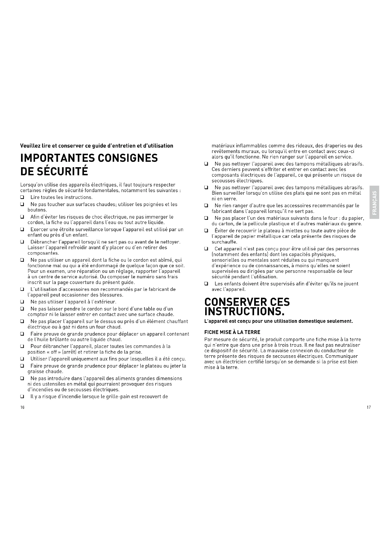 Lorsqu’on utilise des appareils électriques, il faut toujours respecter certaines règles de sécurité fondamentales, notamment les suivantes : ❑ Lire toutes les instructions. ❑ Ne pas toucher aux surfaces chaudes; utiliser les poignées et les boutons. ❑ Afin d’éviter les risques de choc électrique, ne pas immerger le cordon, la fiche ou l’appareil dans l’eau ou tout autre liquide. ❑ Exercer une étroite surveillance lorsque l’appareil est utilisé par un enfant ou près d’un enfant. ❑ Débrancher l’appareil lorsqu’il ne sert pas ou avant de le nettoyer. Laisser l’appareil refroidir avant d’y placer ou d’en retirer des composantes. ❑ Ne pas utiliser un appareil dont la fiche ou le cordon est abîmé, qui fonctionne mal ou qui a été endommagé de quelque façon que ce soit. Pour un examen, une réparation ou un réglage, rapporter l’appareil à un centre de service autorisé. Ou composer le numéro sans frais inscrit sur la page couverture du présent guide. ❑ L’utilisation d’accessoires non recommandés par le fabricant de l’appareil peut occasionner des blessures. ❑ Ne pas utiliser l’appareil à l’extérieur. ❑ Ne pas laisser pendre le cordon sur le bord d’une table ou d’un comptoir ni le laisser entrer en contact avec une surface chaude. ❑ Ne pas placer l’appareil sur le dessus ou près d’un élément chauffant électrique ou à gaz ni dans un four chaud. ❑ Faire preuve de grande prudence pour déplacer un appareil contenant de l’huile brûlante ou autre liquide chaud. ❑ Pour débrancher l’appareil, placer toutes les commandes à la position « off » (arrêt) et retirer la fiche de la prise. ❑ Utiliser l’appareil uniquement aux fins pour lesquelles il a été conçu. ❑ Faire preuve de grande prudence pour déplacer le plateau ou jeter la graisse chaude. ❑ Ne pas introduire dans l'appareil des aliments grandes dimensions ni des ustensiles en métal qui pourraient provoquer des risques d'incendies ou de secousses électriques. ❑ Il y a risque d'incendie lorsque le grille-pain est recouvert de matériaux inflammables comme des rideaux, des draperies ou des revêtements muraux, ou lorsqu'il entre en contact avec ceux-ci alors qu'il fonctionne. Ne rien ranger sur l’appareil en service. ❑ Ne pas nettoyer l'appareil avec des tampons métalliques abrasifs. Ces derniers peuvent s'effriter et entrer en contact avec les composants électriques de l'appareil, ce qui présente un risque de secousses électriques. ❑ Ne pas nettoyer l'appareil avec des tampons métalliques abrasifs. Bien surveiller lorsqu'on utilise des plats qui ne sont pas en métal ni en verre. ❑ Ne rien ranger d'autre que les accessoires recommandés par le fabricant dans l'appareil lorsqu'il ne sert pas. ❑ Ne pas placer l’un des matériaux suivants dans le four : du papier, du carton, de la pellicule plastique et d’autres matériaux du genre. ❑ Éviter de recouvrir le plateau à miettes ou toute autre pièce de l'appareil de papier métallique car cela présente des risques de surchauffe. ❑ Cet appareil n'est pas conçu pour être utilisé par des personnes (notamment des enfants) dont les capacités physiques, sensorielles ou mentales sont réduites ou qui manquent d'expérience ou de connaissances, à moins qu'elles ne soient supervisées ou dirigées par une personne responsable de leur sécurité pendant l'utilisation. ❑ Les enfants doivent être supervisés afin d'éviter qu'ils ne jouent avec l'appareil. CONSERVER CES INSTRUCTIONS. L'appareil est conçu pour une utilisation domestique seulement.